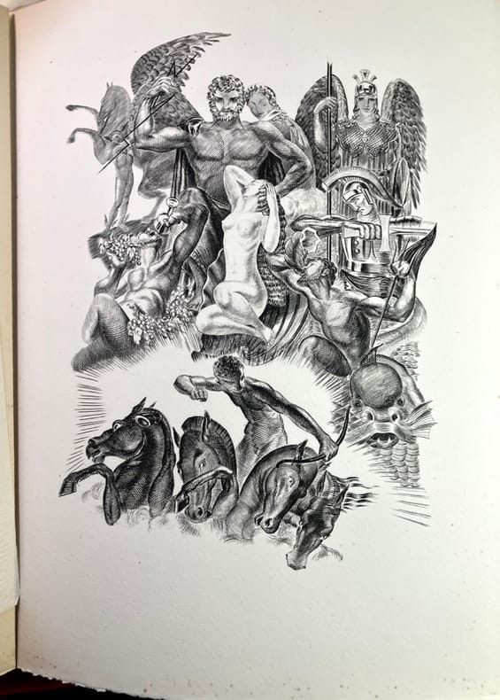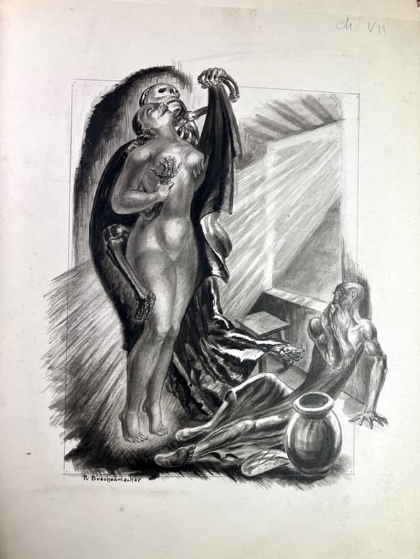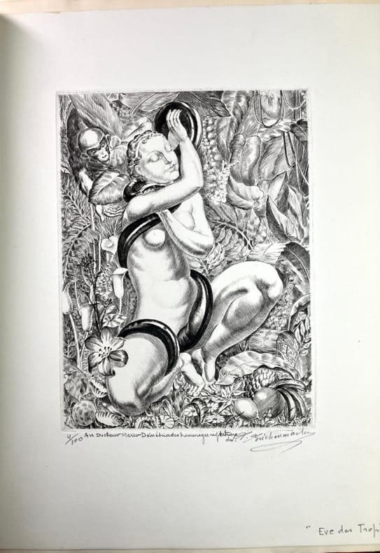 Exemplaire de tête portant un envoi autographe à Mario Dimitriades. Une épreuve d'artiste supplémentaire, justifiée et signée au crayon est dédicacée au collectionneur. Etui fendu, infimes piqûres que quelques pages, la planche d'une vignette manque à l'une des suites. Raymond-Jacques Brechenmacher (1897-1973), peintre et graveur a été lauréat du Grand Prix de Rome en 1922. Cette oeuvre qui fait la part belle aux fantasmagories animales est puissante et expressive. Libraire membre du S.L.A.M. (Syndicat national de la Librairie Ancienne et Moderne) et de la L.I.L.A. (Ligue Internationale de la Librairie Ancienne). N'hésitez pas à prendre contact par mail pour des photographies et des détails supplémentaires, pour des recherches ou des estimations de livres anciens et rares.