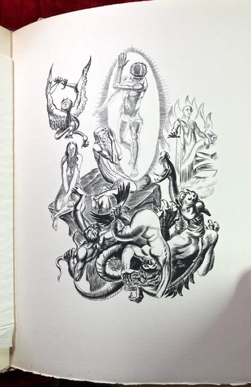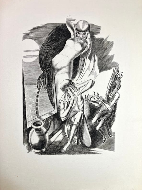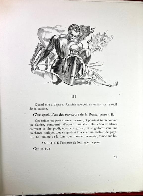 Tirage limité à 290 exemplaires. Un des ex 200 n° sur vélin de Rives contient 20 gravures au burin originales (hors-texte, bandeaux et culs-de-lampe). ON JOINT une gravure signée en épreuve d'artiste. Puissantes gravures au burin qui illustrent à merveille le caractère diabolique du texte de Flaubert. On sait peu de choses sur ce peintre et graveur si ce n'est qu'il fut prix de Rome (section gravure) en 1922. Très bel exemplaire. Photos sur demande.