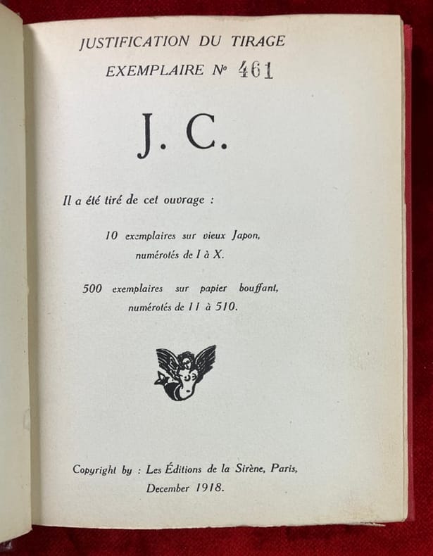 Paris La Sirène 1918 In-12 (h. 17 cm.), 148 pp., demi-reliure de maroquin rouge, dos lisse (reliure moderne).