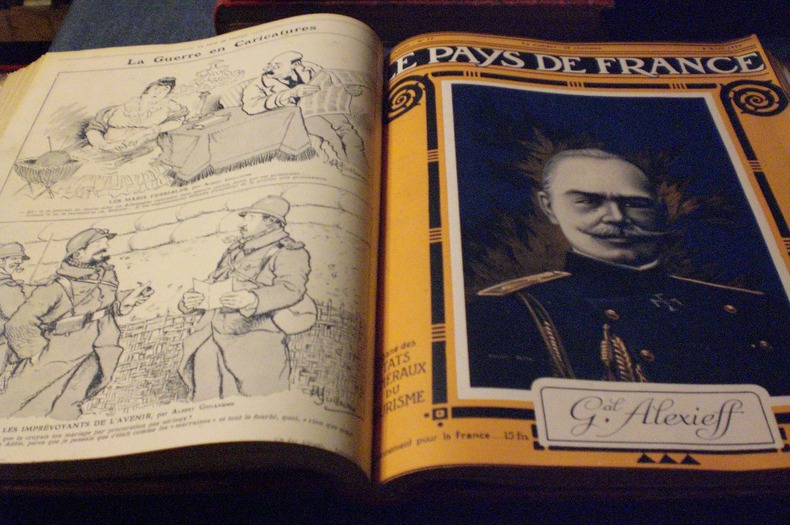 Administration et Rédaction "Le Matin " Boulevard Poissonnière - Paris .Revue hebdomadaire -1914 à1917 - 6 volumes - Du n°6(26 Novembre 1914)au n°167 (27 Décembre 1917) - 21 pages par fascicule - 156 numéros au total - Chaque numéro ayant conserver sa couverture couleur - Nombreuses caricatures par Guillaume,Berings,Orner,Rouff,Rapenot,De La Niziere- Volume in folio demi toile rouge - trés bon état .