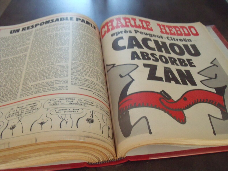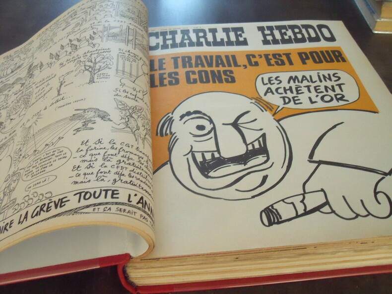 Collection complète des 676 livraisons publiées sur quatorze ans (1969-1982) :HARA-KIRI HEBDO, supplément hebdomadaire du mensuel Hara-Kiri, série complète du n° 1 (3 février 1969) au n° 94 (16 novembre 1970, la fameuse une “ Bal tragique à Colombey, un mort ”. Le sous-titre devient à partir du n° 3 prolongement hebdomadaire du mensuel Hara-Kiri, et le titre à partir du n° 16 L’Hebdo Hara-Kiri, suivi de :CHARLIE HEBDO, série complète du n° 1 (23 novembre 1970) au n° 547 (6 mai 1981) suivi de CHARLIE MATIN, série complète du n° 1 (14 mai 1981, Charlie-Hebdo n° 548) au n° 10 (16 juillet 1981, Charlie-Hebdo n° 557), sans les numéros quotidiens Charlie matin 1 et 2 parus les 16 et 17 mars 1981 ; suivi de :L’HEBDO HARA-KIRI, journal dangereux pour la jeunesse, série complète du n° 1 (22 juillet 1981, Charlie- Hebdo n° 558) au n° 25 ( 7 septembre 1982, Charlie-Hebdo n° 582). Suite à des erreurs de numérotation à l'imprimerie, il n'y eut pas de livraison numérotée 118, 452, 552 ; remplacées par les numéros 119 bis, 453 bis et 553 bis. Bel exemplaire en dépit de quelques rares déchirures.
