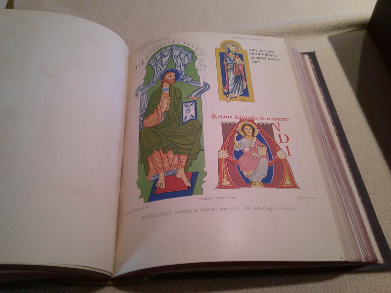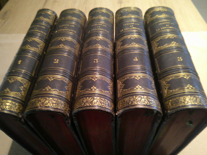 A Paris - Administration Rue Du Pont Lodi - 1848/1851 - 5 Volumes - Complet - tome 1 :1848 -Tome 2 :1849 -Tome 3 : 1850tome 4 : 1851 tome 5 :1851 - Non foliotés environ 400/500 pages par volumes - Illustration dans le texte et nombreux bois hors texte d'après les originaux - Nombreuses planches chromatographiques hors texte d’après les enluminures originales - Fort volume in quarto ,plats papier à grains ,dos cuir à caissons -Tranches rouges - Très bon état pour ce monumental et remarquable ouvrage .