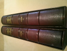 Les Oeuvres de Mâitre François Rabelais docteur en médecine contenant la vie très horrifique du grand Gargantua et les horribles et épouvantables faits et prouesses de son fils le renommé Pantagruel. Complet en 4 volumes, in-8 plein cuir rouge, 21x14, titrage et décors dorés sur dos et les plats, signet rouge, tranche supérieure dorée, 163-143 pp, 194-231 pp, 379 pp, 482-114 pp. Œuvres majeures de Rabelais François, comme Pantagruel (1532) et Gargantua (1534), qui tiennent à la fois de la chronique, du conte avec leurs personnages de géants, de la parodie héroï-comique, de l'épopée et du roman de chevalerie, mais qui préfigurent aussi le roman réaliste, satirique et philosophique, sont considérées comme une des premières formes du roman moderne. Comprend; Garguantua. Pantagruel, suite des songes drolatiques de Pantagruel, etc.. Jean de Bonnot, 1973
