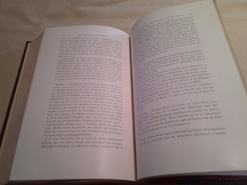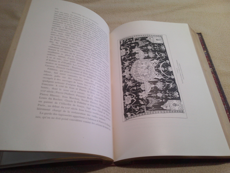 Alfred Mame et Fils 20 x 29 Tours 1886 Volume in-8, reliure de l'époque demi-chagrin rouge à coins, dos à 5 nerfs ornés d'un filet doré, caissons décorés de fers et de fleurons dorés, mention "Tours 1886" dorée en queue, filets dorés sur les plats, tranche supérieure dorée, VIII-533 pp., appendices, table alphabétique, table des planches, frontispice en couleur sous serpente, très nombreuses planches dont 4 chromolithographies. Ouvrage de référence sur l'histoire de la tapisserie. Rousseurs éparses, bonne reliure, coins inférieurs un peu usés. Très bon exemplaire. (EvB12) PHOTOS NUMERIQUES DISPONIBLES PAR EMAIL SUR SIMPLE DEMANDE-DIGITAL PHOTOGRAPS MAY BE AVAILABLE ON REQUEST Livre