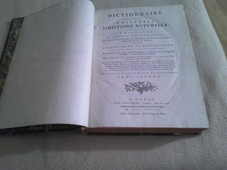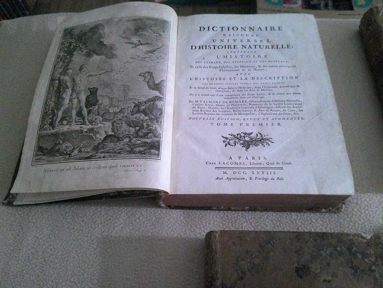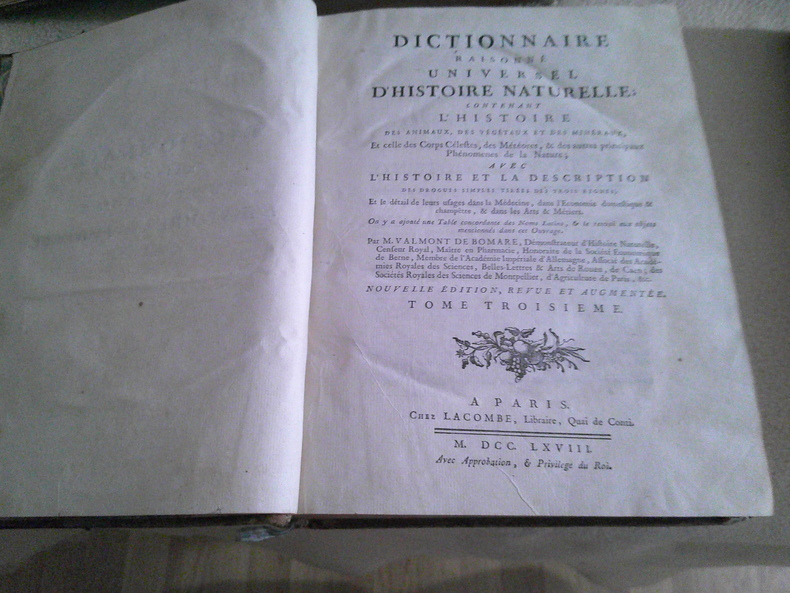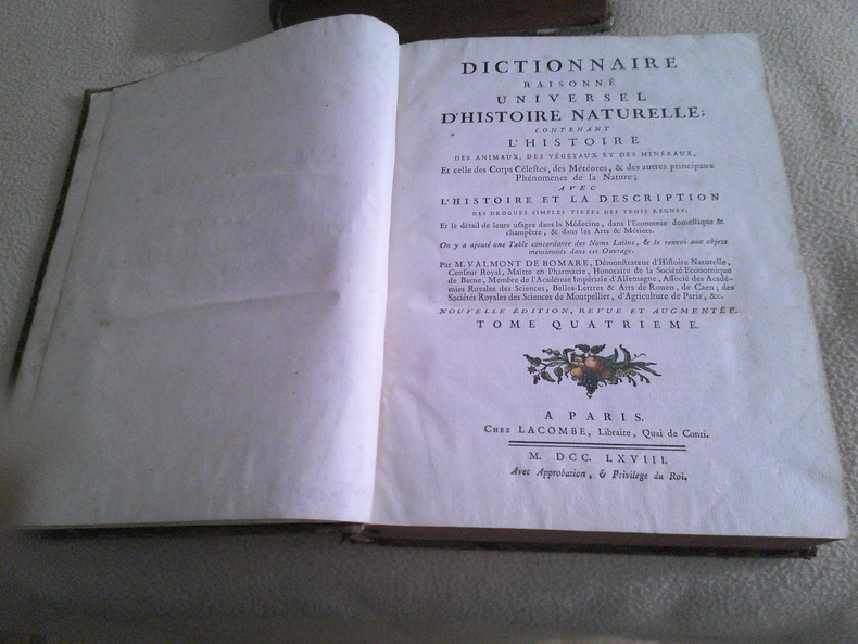 M. Valmont de Bomare : Dictionnaire raisonné universel d'histoire naturelle, contenant l'histoire des animaux, des végétaux et des minéraux, celle des corps célestes, des météores & autres principaux phénomènes de la nature avec l'histoire et la description des drogues simples tirées des trois règnes, le détail de leurs usages dans la médecine, dans l'économie domestique et champêtre & dans les arts & métiers. Avec une table concordante des noms latins et le renvoi aux objets mentionnés dans cet ouvrage. Avec le supplément au dictionnaire, contenant des tables alphabétiques et systématiques, pour tous les objets d'histoire naturelle, de physique et des arts, pour la médecine, c'est-à-dire pour les vertus des médicaments et pour les caractères des maladies auxquelles ils conviennent, sur le choix qu'il y a à faire des remèdes, une table de leurs doses et des formes sous lesquelles on peut les employer. Des articles retouchés, ou nouveaux, tirés ou traduits des sources les meilleurs et les plus modernes, et même des porte-feuilles de plusieurs naturalistes des plus célèbres par M. Vicat, D.M. Valmont de Bomare, naturaliste français, né à Rouen en 1731. Dès 1764, il publiait un Dictionnaire raisonné universel d'histoire naturelle : Il s'agit du premier dictionnaire d'histoire naturelle. Cet ouvrage a permis de faire découvrir l'histoire naturelle auprès du grand public et joua un rôle éminent dans sa popularisation au XVIIIe siècle.