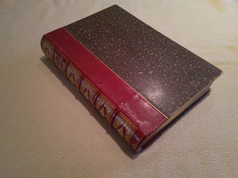 Tours Alfred Mame et fils 1886 -in-8 demi-chagrin un volume, reliure demi-chagrin rouge grand in-octavo à coins (binding half shagreen in-octavo with corners)(28,2 x 19 cm), dos à nerfs (spine with raised bands) décoré "or" et à froid (gilt and blind stamping decoration), Auteur et titre frappés "or" (gilt title) dans un encadrement d'un filet "or", filet "or" en place des nerfs avec un filet à froid de part et d'autre des nerfs, entre-nerfs à fleurons "or" dans un encadrement de trois filets "or" avec rinceaux "or" aux angles, double filets "or" en tête et en pied, plats décorés "or" (gilt decoration) d'un filet "or" aux mors et aux coins, toutes tranches lisses dorées, orné de 119 figures in-texte en noir + planches hors-texte dont 4 en chromolithographie (119 wood engravings in the text, and 8 plates, 4 of which are in color), VII-573 pages-[8] p. de pl., 1886 Tours : Alfred Mame et fils Editeur,