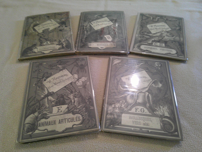 Paris -Berlin chez l'éditeur - Sans date vers 1900 - 5 volumes -complet - Mammifères- Oiseaux - Amphibiens -Poissons - Animaux articulés -Mollusques -Vers - 62 pages par volume -92 vignettes couleurs légèrement gaufrées dans le texte . Volume in 8 ,cartonnage de l'éditeur - Intérieur frais - un peu d'usure des reliures sinon bon état pour l'ensemble -