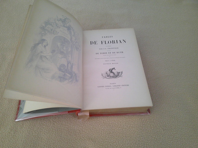 Librairie Garnier Frères -Rue Des Saints Pères -Paris -Sans date circa 1880 - Précédées d'une notice sur la vie et des ouvrages de Florian par P.J.Stahl (Pierre Jules Hetzel )466 pages -Catalogue in finé - Les cinq livres en un -110 fables - Illustrations noir et blanc dans le texte et hors texte dont un frontispice de Jean Jacques Granville -Volume in octavo ,cartonnage éditeur pleine percaline rouge ,premier plat orné d'une grande composition ,dos à 5 caissons -Très bel exemplaire proche du neuf .