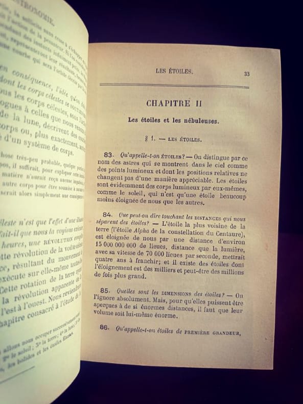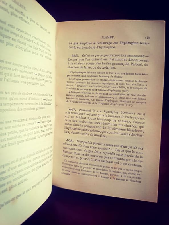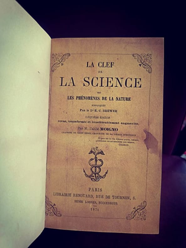 Paris Librairie Renouard 1874 1 in 12 Reliure percaline 727[pp Cet exemplaire n'est pas une simple réédition ; c'est la 5ème édition métamorphosée par l'Abbé Moigno, véritable encyclopédie portative du savoir positiviste. À une époque où les universités étaient interdites aux femmes, ce volume de 727 pages a été l'outil clandestin de l'émancipation intellectuelle féminine dans l'espace domestique.La structure en "questions-réponses" de Brewer est une prouesse cognitive qui fragmente la complexité du monde en unités logiques assimilables. C'est un précurseur des méthodes d'apprentissage structurées, essentielles pour les esprits ayant soif de systèmes clairs (neuro-atypie).Porteur d'une patine d'usage authentique. La reliure a "vécu", témoignant de son succès pédagogique, mais elle conserve une prise en main d'une solidité exemplaire. L'intérieur est complet, dense et prêt pour une nouvelle vie d'étude.