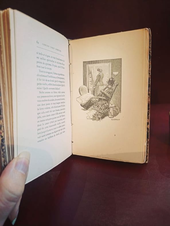 Illustrations de G. Neymarck, gravé par F. Horrie Le bon crime, l'adoption, l'Habilleuse, Bonheur manqué, Bonne fille, l'Odeur du buis, La petite papetière, Pilier de café. Très bel exemplaire, reliure de l'époque demi-cuir, 14x9cm, très bel état intérieur, 296pp. Couvertures d'origines conservées. Paris, Alphonse Lemerre, 1894 ref/299