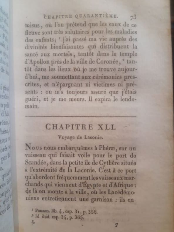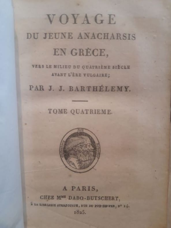 Édition en partie originale, la plus complète et la dernière préparée par l’auteur. Il s’agit d’un voyage historique fictif, qui est une véritable somme des connaissances du XVIIIe siècle sur la Grèce antique et qui a contribué à développer l’intérêt pour celle-ci en France et en Europe. J.J. Barthélémy a publié son Voyage du jeune Anacharsis en Grèce en 1788, après avoir travaillé pendant une trentaine d’années à sa préparation. Ce texte, destiné à des fins pédagogiques, devait à l’origine raconter la formation d’un jeune homme au cours d’un voyage. Cependant, ayant choisi de situer ce voyage dans la Grèce du IVe siècle av. J.-C., Barthelemy a été amené à composer un vaste panorama de la Grèce de cette époque. Il a séduit la société de l’époque en lui révélant pour la première fois une Antiquité “archéologique” reconstituée et vivante. De nombreuses éditions se sont succédé et ont contribué à la propagation des connaissances sur la Grèce antique ainsi qu’à la diffusion du goût néoclassique. Le premier tome est entièrement consacré à une longue introduction historique, l’atlas comporte un portrait de l’auteur, gravé par P. G. Langlois et 39 cartes, planches et vues (19bis non annoncée dans la liste), la carte générale de la Grèce, fut publié tardivement et manque aux exemplaires de 1799. Barbié du Bocage (1760-1825), géographe, cartographe, Jean-Denis Barbié, dit Barbié du Bocage, a consacré l’essentiel de ses travaux à la cartographie de l’Antiquité. Ses plus belles contributions à l’édition ont été l’atlas du Voyage du jeune Anacharsis et les cartes du Voyage pittoresque en Grèce de Choiseul-Gouffier (1782-1824). Jean-Jacques Barthelemy (1716-1795), archéologue et numismate, responsable du cabinet des médailles de la Bibliothèque du roi et ami du comte de Caylus. P2-4A