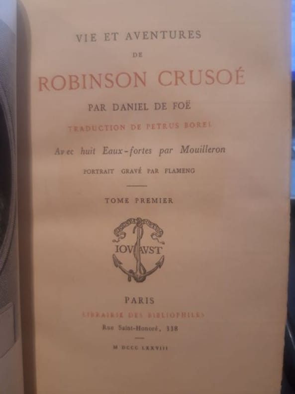 Illustré de trois gravures en frontispice figurant la Cérémonie des jongleurs pécherais, Moraï des Otahitiens, et au dernier volume: Embarras de Robinson et de Vendredi à l'ouverture de leurs caisses. Rare robinsonnade qui est très souvent attribuée abusivement à J. H. Campe. Robinson et Vendredi voyagent dans les mers du sud, et l'intrigue se déroulent ici à Tahiti. Ex-libris Elie Petit. Quelques épidermures, coins frottés.