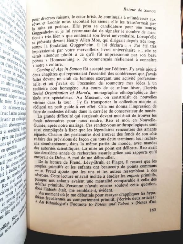 Autobiographie de la célèbre anthropologue américaine Margaret Mead (1901-1978), élève de Frantz Boas et Ruth Benedict, partie à 23 ans à Samoa, en Polynésie, dont elle rapporta "Coming of Age in Samoa", son premier ouvrage sur la sexualité des adolescentes dans les sociétés primitives, qui fit date.