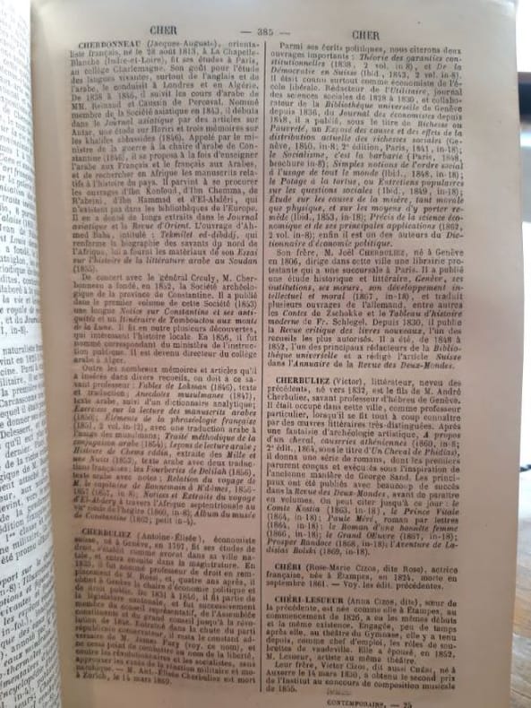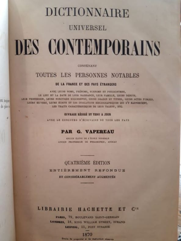 Bon exemplaire de ce fameux et utile dictionnaire. — "Comme tout ce qui sort de la plume de M. Vapereau, le “Dictionnaire des contemporains” est très-bien écrit ; on y retrouve à chaque ligne le normalien qui s'est nourri de la moelle des génies de l'antiquité. Ajoutons que c'est un des livres qui nous ont le plus aidé dans la partie de notre travail que son cadre embrasse. Il nous a épargné une correspondance pénible et fastidieuse. La biographie contemporaine est un champ que M. Vapereau a péniblement défriché à notre profit, et nous ne pouvons nous empécher de reconnaître que le “Dictionnaire des contemporains” est une oeuvre éminemment utile, où l'on trouve une foule de renseignements précieux et presque toujours exacts." (Pierre Larousse, Grand dictionnaire universel du XIXe siècle)