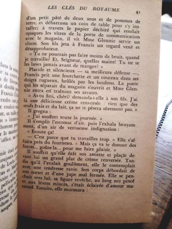 Nous suivons ici la vie du Père Chisholm, né d’un père Protestant et d’une mère Catholique, il va en devenant prêtre souvent se heurter à l’étroitesse d’esprit et le dogmatisme de l’Eglise Catholique, à laquelle il consacrera pourtant sa vie. Adolescent et novice, son cœur balance entre son amour pour Dieu et Nora, sa douce cousine. Les vicissitudes de la vie conduiront Nora, fille-mère, au suicide. Sous le choc, Francis part en Espagne en séminaire et commence sa carrière de prêtre d’abord en Ecosse et ensuite en Chine, où il passera presque toute sa vie. En Chine, il devra bâtir sa mission de zéro, sans aucune aide financière de son diocèse. Il sera confronté à une épidémie de peste et à une guerre intestine mais il tiendra bon et protégera ses ouailles contre vents et marées. Sans le fanatisme des protestants d'Ettal prêts à mettre à mal tout catholique s'aventurant dans leur ville, les parents de Francis Chisholm ne se seraient pas noyés dans la Tweed en crue et lui-même n'aurait pas été envoyé à douze ans comme boulonneur aux chantiers navals de Darrow à cause de l'avarice de sa grand-mère maternelle. Sans l'intransigeance du curé de Saint-Dominique, la jeune fille qu'il aimait ne se serait pas tuée et il n'aurait pas accédé au désir de sa tante Polly et de l'abbé MacNabb, Mac le Roux, en entrant au séminaire. A-t-il eu raison de choisir la voie de la prêtrise ? Il en doute devant les difficultés qu'il rencontre alors que son camarade d'enfance Anselme Mealey évolue à l'aise dans les milieux ecclésiastiques. La raison de leurs carrières est là, dans cette différence : Anselme sait servir l'Église, Francis ne songe qu'à être fidèle à l'enseignement du Christ. Mac le Roux a bien compris, qui le soutient et l'envoie finalement évangéliser en Chine. C'est sa vie courageuse et mouvementée de missionnaire dans la Chine encore livrée aux exactions des seigneurs de guerre, la vie d'un homme exemplaire pour qui les maîtres mots sont tolérance et charité, que relate A. J. Cronin dans Les Clés du royaume, un de ses plus beaux romans. vol relié, in8, demi cuir, jolie reliure, frottements au dos, 20x15, bel état intérieur, 368pp. Couverture conservée. Paris, édition milieu du monde, vers 1960 ref/278