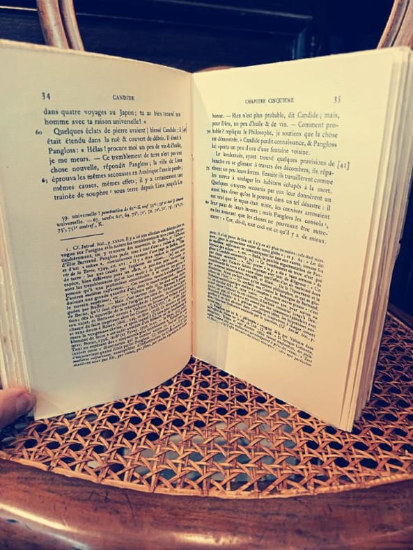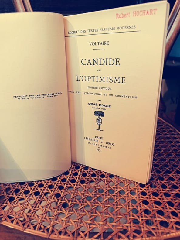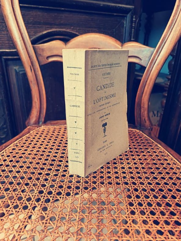 Cette édition originale de Candide est très rare. S.l. [Genève, Cramer], 1759. [Reliés à la suite] : II- [Maubert de Gouvest, Jean-Henri]. Ephraïm justifié. Mémoire historique et raisonné sur l’état passé, présent et futur des finances de Saxe... adressé par le Juif Ephraïm à son cousin Manasses d’Amsterdam. Nouvelle édition. Erlangen, 1758. III- [Du même]. Lettre du Prince de Prusse mourant, au Roi son frère. Erlangen, 1758. IV- [Rémond de Saint-Sauveur]. Remerciement d’un Particulier à Messieurs les Philosophes du Jour. V-[Coyer, Gabriel-François]. Lettre au R.P. Berthier sur le matérialisme. Genève (Paris), 1759. Soit 5 ouvrages reliés en 1 volumes in-12 de : I/ (1) f.bl., 299 pp. (signatures A-Nh), (1) f.bl. ; II/ viii pp., 103 ; III/ 23 pp. ; IV/ 8 pp. ; V/ 77 pp. L’encre noire a légèrement déchargé en transparence lors de l’impression de Candide. Reliure de l’époque en veau marbré, dos lisse orné de motifs dorés, pièce de titre de maroquin rouge, tranches rouges. Reliure de l’époque. 161 x 93 mm.