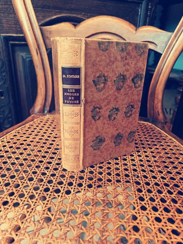Londres (CAZIN) 1782 in-18 plein-veau un volume, reliure plein veau havane blond marbré et moucheté in-18 (binding full calfskin in-18) (8 x 12,6 cm), Reliure d'époque, dos long (spine without raised bands), titre frappé or (gilt title) avec double filets "or" de part et d'autre du titre, double filets "or" en place des nerfs et en tête et en pied, entre-nerfs à fleuron "or" au fer plein dans un encadrement à double filets "or" avec rinceaux "or" aux angles, plats décorés "or" d'un triple filet "or" en encadrement, filet "or" sur les coupes, roulette "or" sur les chasses, toutes tranches lisses dorées (gilt edges), texte imprimé sur papier bleuté, orné d'un frontispice représentant : "Psyché et Cupidon" gravé par Duponchel d'après Marillier, 232 pages + 4 pages de catalogue Editeur, 1782 à Londres (CAZIN) Editeur,