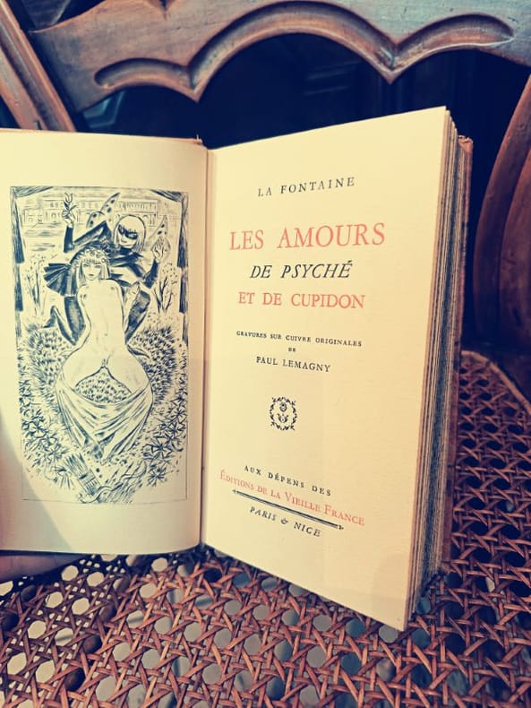 1933 LES AMOURS DE PSYCHE ET DE CUPIDON Edition conforme aux textes originaux , établie par Louis PerceauOrnée d' illustrations en couleurs par Calègle.Le Livre du bibliophile - Georges Briffaut , 1933 , in8(17x24) 1/2 chagrin rouge à coins, tête dorée , couvertures conservées , 323 pp .Edition numérotée sur velin de rives (491)Rousseurs