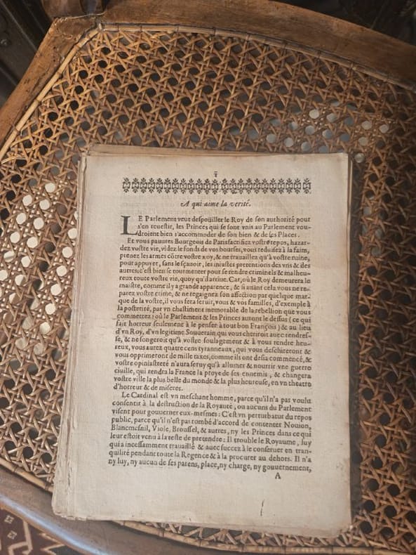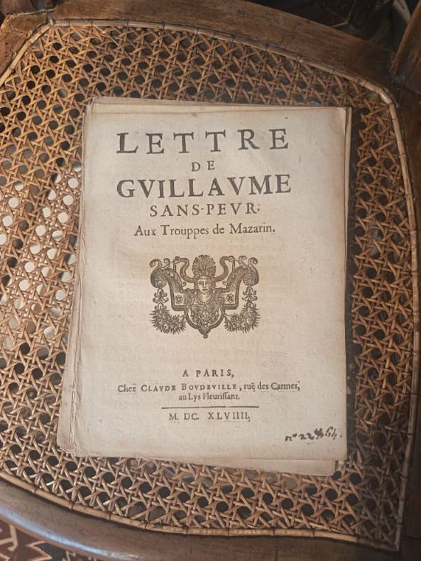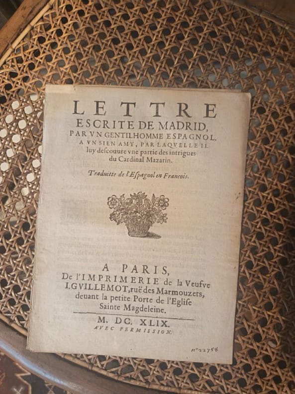 1649-1651 Voici une opportunité rare de posséder non pas des livres, mais des pièces d'archives intactes. Ces dix Mazarinades d'exception sont les munitions médiatiques de la Fronde, l'écho papier de la seule guerre civile française du XVIIe siècle qui vit la presse pamphlétaire triompher du pouvoir absolu. Elles offrent une immersion physique dans l'effervescence de Paris assiégé (1649–1651).Le véritable trésor ici réside dans la qualité muséale de ces feuillets : Ces imprimés, fragiles par nature, sont parvenus jusqu'à nous dans un état "excellent". Le papier, souvent de mauvaise qualité à l'époque car imprimé à la hâte, est ici étonnamment frais et propre. C'est une rareté qui témoigne d'une conservation sans altération durant près de 375 ans.Feuillets Libres Authentiques : La présentation en pages volantes réunit dans une pochette simple n'est pas un défaut, mais une preuve d'authenticité. Elle rappelle la manière dont ces pamphlets étaient distribués à la criée dans les rues de Paris, échappant à la reliure pour une diffusion maximale.La sélection inclut des pièces maîtresses : le Testament solemnel (la satire la plus célèbre) et la Déclaration du Roy (l'acte officiel d'interdiction de Mazarin), assurant à ce lot une valeur documentaire et collectionneur de premier planCes imprimés sont l'ADN d'une révolution médiatique. Pour l'amateur d'histoire, d'imprimés anciens ou de journalisme politique, ce lot représente un investissement dans un pan unique de notre patrimoine écrit.
