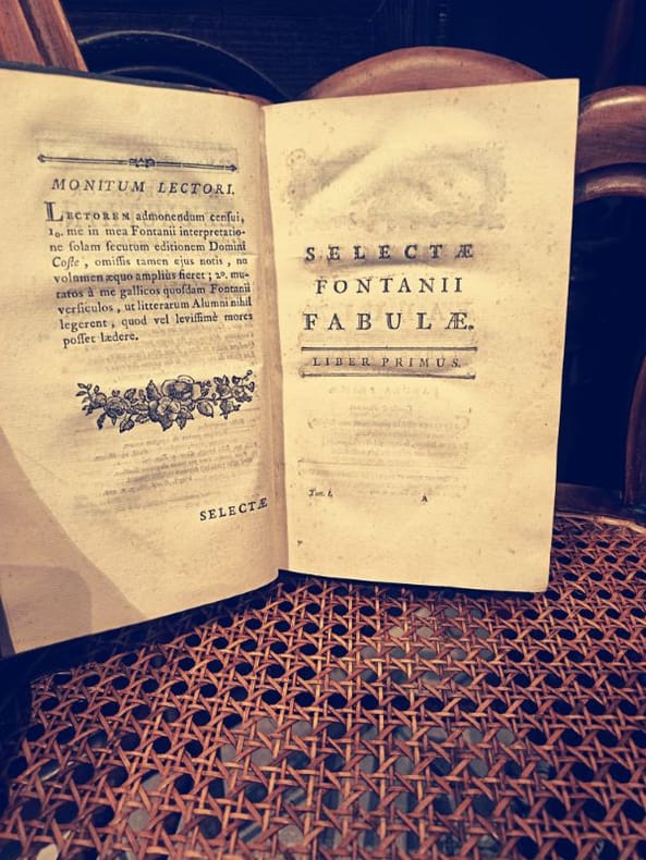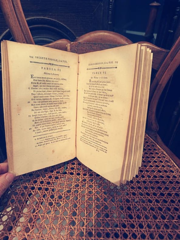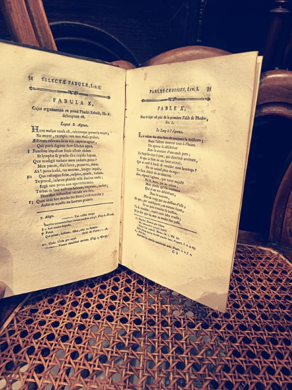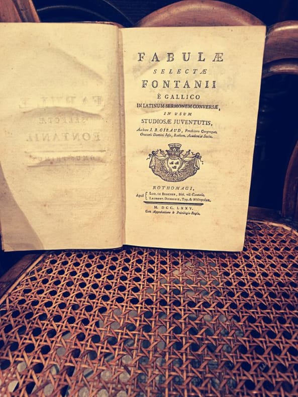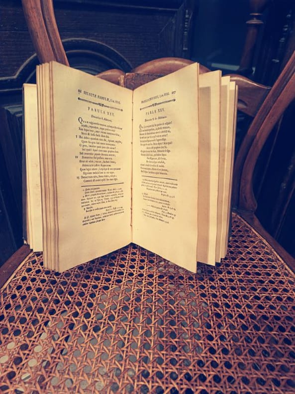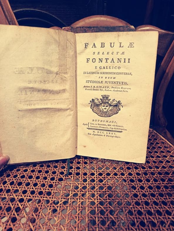 Paris, Le Boucher 1775 2 in -8 Relié plein cuir 460 [p.p]580 [p.p] Ceci n'est pas une simple traduction ; c'est un fragment héroïque de l'enseignement français prérévolutionnaire. Ce livre fut l'outil de formation de l'élite intellectuelle, le pont jeté entre la poésie de La Fontaine et l'érudition classique. Posséder ces deux volumes, c'est acquérir la quintessence de la pédagogie des Lumières.Un Survivant de l'HistoireL'édition de 1775 par Le Boucher est un témoignage direct de l'époque de Louis XVI. Le fait que les deux tomes soient complets est une victoire sur le temps pour un ouvrage destiné à être manipulé par la jeunesse studieuse. L'intérieur est imprimé sur papier vergé de qualité, une technique qui assure la résistance du texte malgré les siècles.La Beauté des CicatricesLe caractère de "survivant" de cet ouvrage s'incarne dans sa reliure. Si le plein cuir témoigne du luxe de l'édition, l'état très usé et incomplet de la reliure n'est pas un défaut, mais une cicatrice d'honneur. Elle prouve que ce livre a été intensément utilisé, aimé et étudié, le rendant authentique bien plus qu'un exemplaire stérile. Le texte est intact, le savoir est préservé.Ne manquez pas cette opportunité rare d'acquérir l'outil pédagogique des élites du XVIIIe siècle. Ce duo de survivants attend son nouveau gardien.