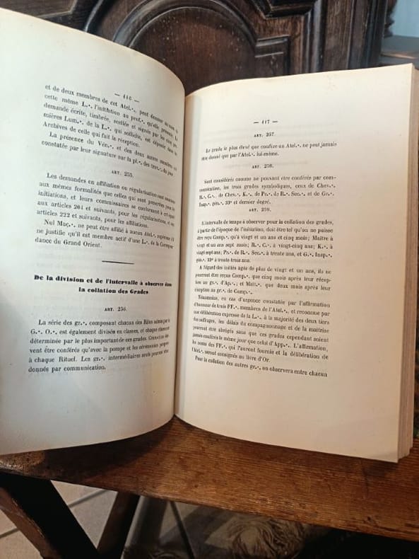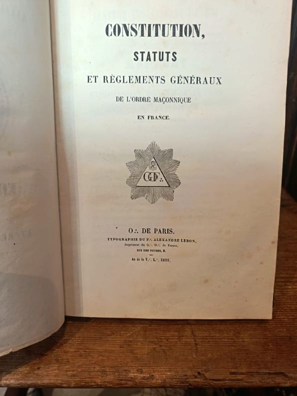 Paris, Alexandre Lebon 1859 1 in -8 Demi chagrin 231 [p.p] Ceci est un livre qui n'aurait jamais dû se trouver sur le marché. Il ne s'agit pas d'une interprétation ou d'une histoire, mais du corpus légal et rituel qui régissait l'Ordre Maçonnique en France en 1859. Imprimé sous l'autorité du Grand Maître et à la Gloire du Grand Architecte de l'Univers, ce volume est normalement réservé aux seuls Initiés ayant prêté serment.La Loi du secret révéléeL'édition de 1859 par Alexandre Lebon est un témoin crucial de l'organisation et de la discipline de l'Obédience française sous le Second Empire. Ce recueil est le miroir de l'autorité suprême : il détaille les lois, les devoirs et les structures qui permettaient au Grand Maître de gouverner l'Ordre. Sa présence sur le marché est donc une fuite documentaire exceptionnelle.La rareté de cet ouvrage ne tient pas seulement à son âge, mais à son statut de document interne. Il n'a jamais été destiné au public profane. L'acquisition de cet exemplaire est un investissement unique dans l'histoire administrative et rituelle de la Maçonnerie. Il offre un accès privilégié et non filtré à la discipline interne de l'Ordre.Saisissez cette opportunité d'acquérir ce qui devait rester secret. Ce livre est la loi même de la Franc-Maçonnerie de 1859, et son accès est un privilège.