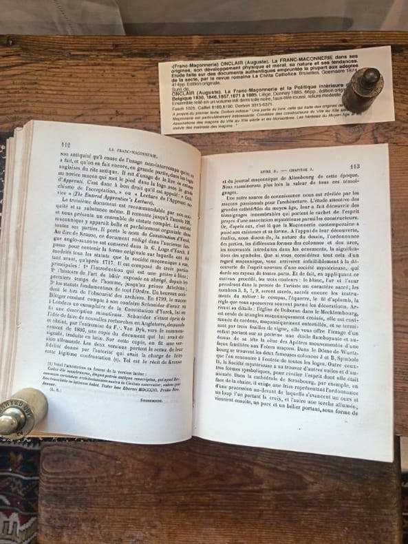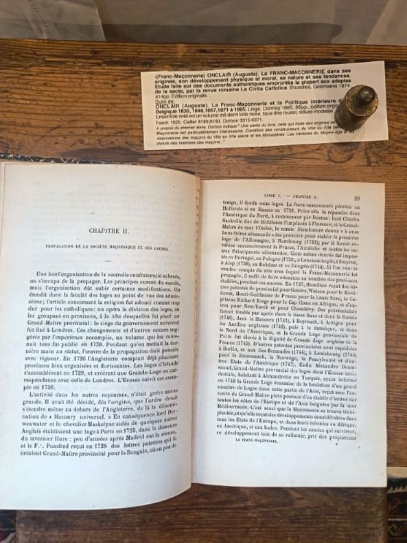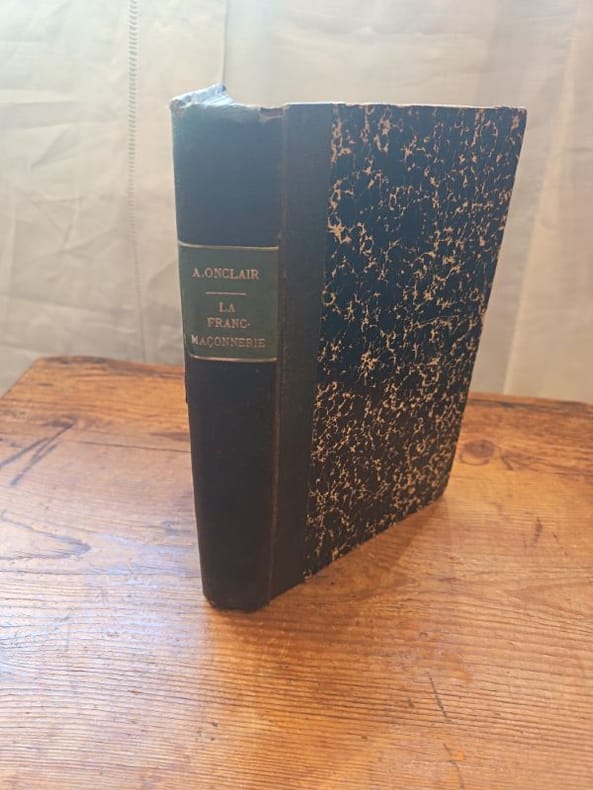 Bruxelles/Liège, Goemaere / Donnay 1874/1885 1 in -8 demi toile noire 414 [p.p]66 [p.p] Ceci est un document d'archive exceptionnel, une union intellectuelle rare. Ces deux ouvrages d'Onclair, reliés ensemble en un seul volume, offrent une étude complète et profonde de l'histoire et de l'influence de la Franc-Maçonnerie non pas en France, mais en Belgique. C'est une fenêtre d'une précision unique sur les rapports complexes entre l'Ordre et la politique intérieure belge au XIXe siècle.Deux Éditions Originales IncontournablesTitre : . Éditeur : Donnay, Liège. Date de Parution : 1885 (Édition Originale).Le fait de posséder ces deux éditions originales dans un même volume renforce leur valeur archivistique. Le premier titre pose le cadre philosophique et moral de l'Ordre, tandis que le second apporte l'analyse factuelle, couvrant les grandes dates de confrontation politique belge du XIXe siècle.L'Investissement dans l'Histoire RégionaleL'acquisition de ce volume est un investissement ciblé dans l'histoire sociopolitique. Les études sur la Maçonnerie hors de France, et particulièrement celles se concentrant sur un contexte national précis comme la Belgique, sont intrinsèquement rares et difficiles à rassembler. Ce duo d'Onclair est un témoignage direct des conflits idéologiques et de l'influence sociétale de la Franc-Maçonnerie, essentiel pour l'historien ou le collectionneur spécialiste.Saisissez cet ensemble complet. Il est la clé pour comprendre un siècle de politique belge à travers le prisme de son Ordre le plus influent.