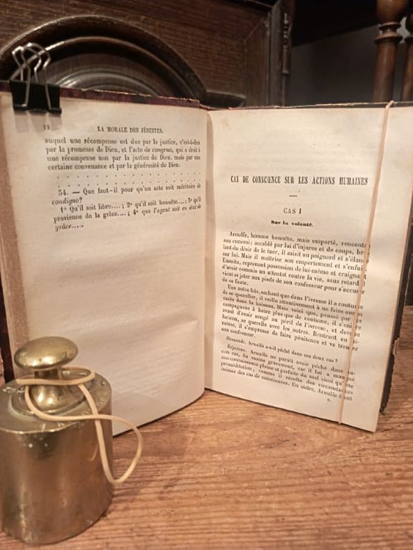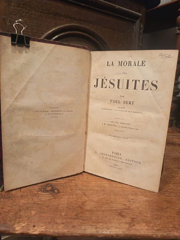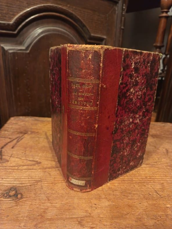 4 ouvrages en 1 volume in-12 (16 x 9 cm), veau porphyre (reliure de l’époque), dos lisse orné à la grotesque, pièce de titre en maroquin brun, triple filet doré encadrant les plats, roulette dorée sur les coupes et sur les chasses, tranches marbrées, annotation manuscrite sur une garde blanche, 111-[1]-191-[1]-2-[2]-3 à 43-[1]-xii-13 à 108 pages (complet). Légers frottements aux mors et coins, page de titre du troisième ouvrage mal reliée, rousseurs éparses. État correct. Recueil de quatre textes portant sur la Compagnie de Jésus, congrégation fondée en 1534 par saint Ignace de Loyola, et regroupant divers prêtres et religieux. Ces quatre textes sont ouvertement hostiles à la Compagnie : le Monita Secreta fut notamment rédigé par un ancien jésuite chassé, tandis que les autres textes évoquent des “régicides”, “rites chinois”, ou encore des “vols”. Rare exemplaire.