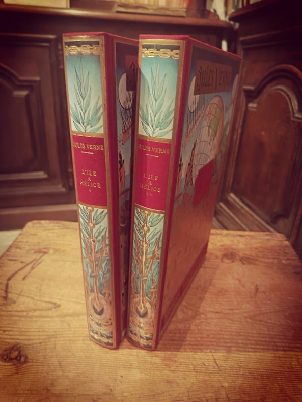 Collection les voyages extraordinaires Complet un volume, superbe reliure, tête dorée, signet, lettrines, culs-de-lampe reliure plein cuir, 21x14, ornées sur le dos de motifs dorés, très bon état, parfait état intérieur, 359 pages. Jean de Bonnot, 1979 L’Ile à Hélice, l’art du voyage - Tome 26 La croisière annuelle de milliardaires américains embarqués sur une fabuleuse machine va essuyer une invasion de pirates, une attaque de cannibales et d’autres aventures mémorables pour le quatuor de musiciens français retenus contre leur gré. La romance impossible entre deux jeunes gens préludera les affrontements fatidiques entre les factions de passagers irresponsables.