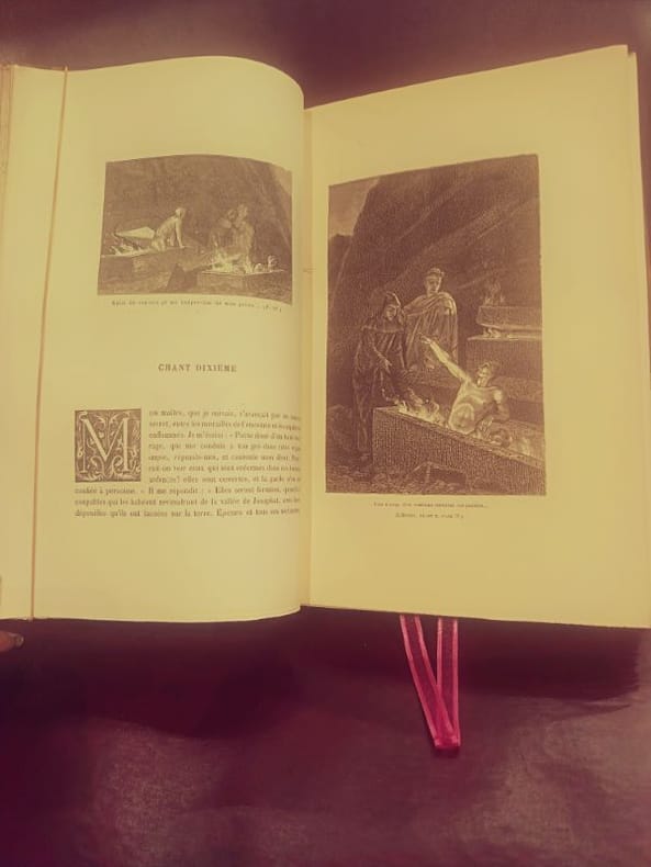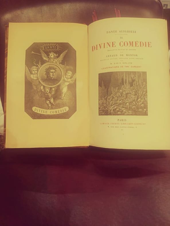 Dante Aligheri. La divine comédie; L'Enfer traduction nouvelle et notes par L. Espinasse-Mongenet, préface de Charles Maurras "L'Enfer" est la première partie de "La Divine Comédie" de Dante Alighieri. Cette œuvre est un poème épique médiéval qui raconte le voyage de Dante à travers l'Enfer, le Purgatoire et le Paradis. Dante, le protagoniste, est guidé à travers ces trois royaumes par le poète romain Virgile et par Béatrice, son amour idéalisé. Dans "L'Enfer", Dante décrit sa descente aux enfers, où il rencontre diverses âmes tourmentées et pécheurs qui sont punis pour leurs péchés dans des circonstances appropriées à leurs fautes. L'Enfer est divisé en neuf cercles, chacun destiné à des péchés spécifiques, allant des péchés les moins graves dans les cercles extérieurs aux péchés les plus graves dans les cercles intérieurs. Le dernier cercle, le neuvième, est réservé à Satan lui-même. Au cours de son voyage à travers l'Enfer, Dante explore les conséquences du péché, la justice divine et la nature de la punition éternelle. La "Divine Comédie" est une œuvre riche en symbolisme et en allégories, et elle est également une représentation de la théologie chrétienne médiévale. "L'Enfer" est la partie la plus célèbre de l'œuvre et a eu une influence profonde sur la culture occidentale. Elle est non seulement une exploration de la damnation, mais aussi une réflexion sur la nature de la moralité et de la rédemption. bel envoi autographe du traducteur + ex dono manuscrit en Italien fort vol. in8, 200x150, broché, bel état intérieur, 451pp. Librairie Nouvelle, Paris, 1913 ref/201