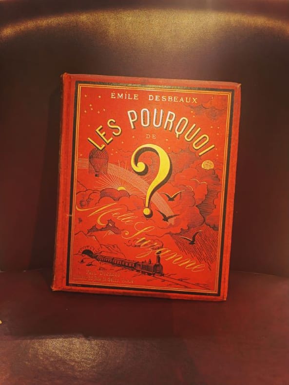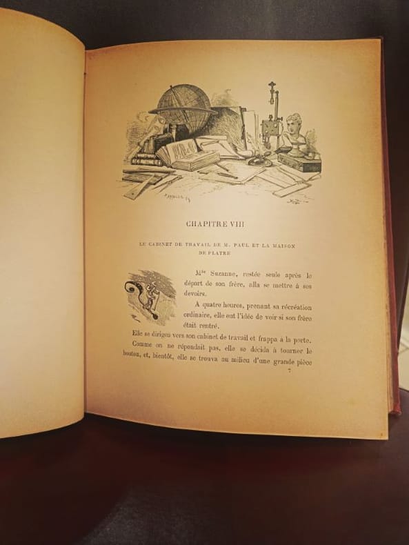 Paris, P. Ducrocq, 1883, gr. in-8vo, 286 p., illustré (page III accidentée), gardes avec gribouillages d’enfant crayon papier, reliure en percaline rouge illustrée en noir et or, tranches dorées. Très bel exemplaire.