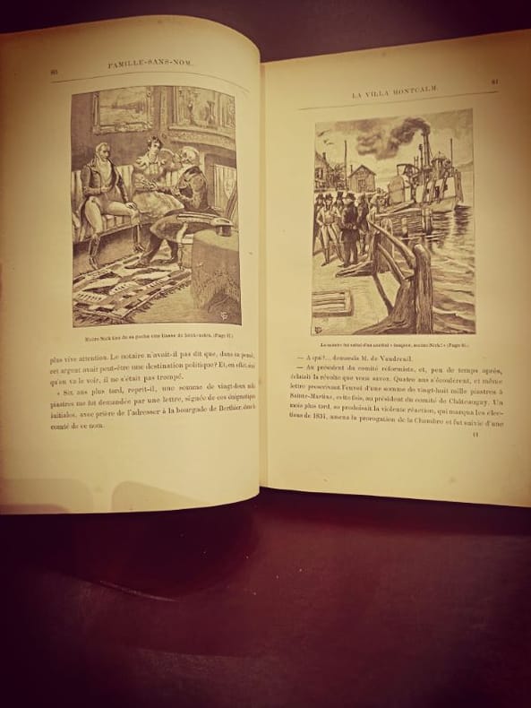 Première édition illustrée de 82 dessins de Tiret-Bognet, et une carte en couleurs du cours du Saint-Laurent. Catalogue EX in fine pour 1890. Cartonnage aux 2 éléphants de type Lenègre 3. Second plat de type Lenègre e. Ce cartonnage n'a connu que la couleur rouge. Quelques rousseurs éparses sur un papier bien blanc. Cette édition porte une étiquette ajoutée sur le cartouge corrigé, Une famille sans nom, devenant Famille sans nom avec la nouvelle étiquette. Belle plaque supérieure, aux ors bien nets. Coins bien pointus et rigides. Tranches dorées régulières. Dos uniformément insolé mais aux ors bien présents. Coiffes légèrement repliées. Beau second plat, sans défaut. Percaline brillante. Bel exemplaire, bien ferme et solidaire. Histoire d'une famille française du Canada pendant la rébellion des Patriotes (1837-1838) contre l'injustice britannique. Un des titres les plus graves de l'auteur, sans fin heureuse. - Photographies et détails sur www.Edition-Originale.com -