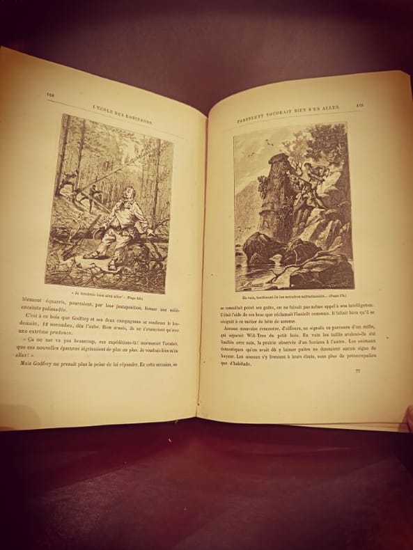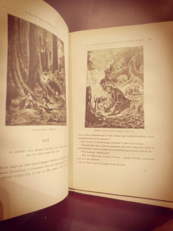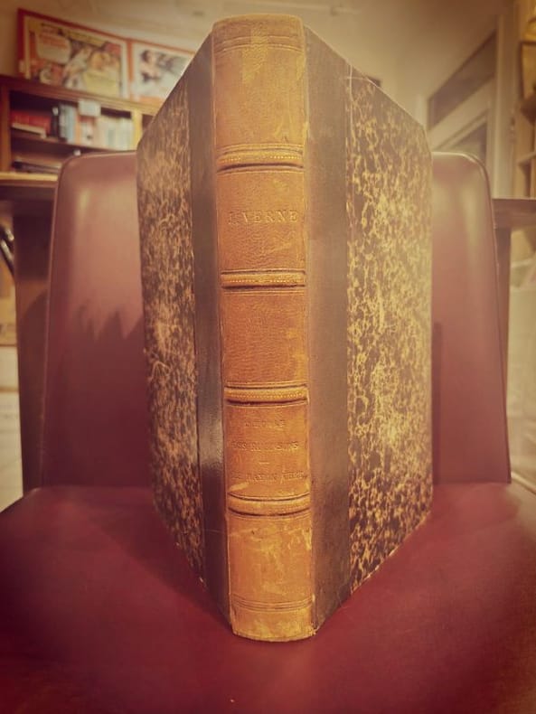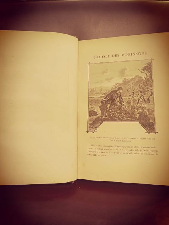Nouvelle édition, collection les Voyages extraordinaires. 51 dessins de Benett. Cartonnage d'éditeur dit "Au deux éléphants ", avec le second plat et dos relié Lenègre "L'École des Robinson" : Ce roman raconte l'histoire d'une famille suisse qui se retrouve naufragée sur une île déserte et qui doit apprendre à survivre dans un environnement hostile. Ils sont inspirés par les aventures de Robinson Crusoé pour surmonter les défis de la survie. L'œuvre explore des thèmes tels que la débrouillardise, la résilience et l'ingéniosité humaine. "Le Rayon-Vert" : "Le Rayon-Vert" est un roman qui met en scène les aventures de deux jeunes amis, Helena et Hector, qui se lancent dans une quête pour observer le phénomène du "rayon vert" au coucher du soleil. Ce phénomène naturel, qui consiste en un flash vert juste après le coucher du soleil, est entouré de mystère et de superstitions. Le roman explore la fascination de l'humanité pour la nature et les merveilles de l'univers. vol. in-4, 280x190, bel état intérieur, gravures, toutes tranches dorées, 195pp + catalogue Hetzel Hetzel, sans date vers 1898/1902