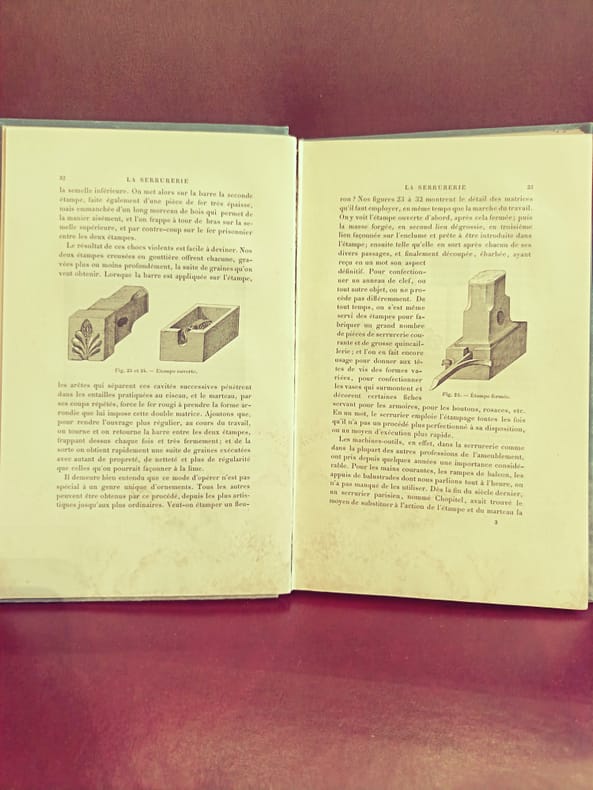 Exposition universelle 1889, médaille d'argent. résistance des materiaux, assemblages, elements de geometrie, barrieres et serrurerie de jardin, portes, serrurerie funeraire et religieuse, serrurerie de batiment, grilles et balcons, marquises et verandahs, ponts et passerelles, developpement des volumes et des lignes qui s'y rattachent, combles et fermes, rampes et escaliers. Classification Dewey : 683-Quincaillerie, serrurerie