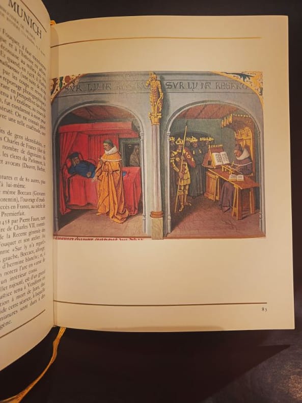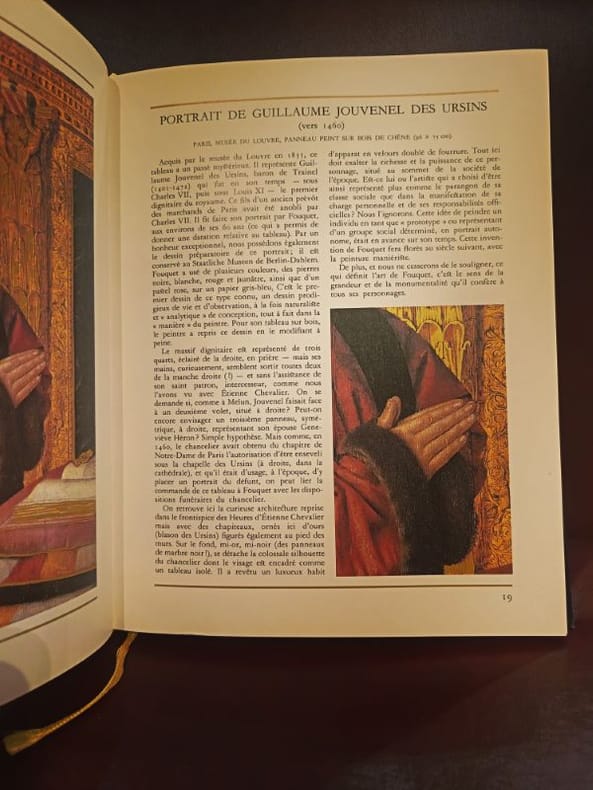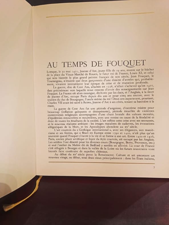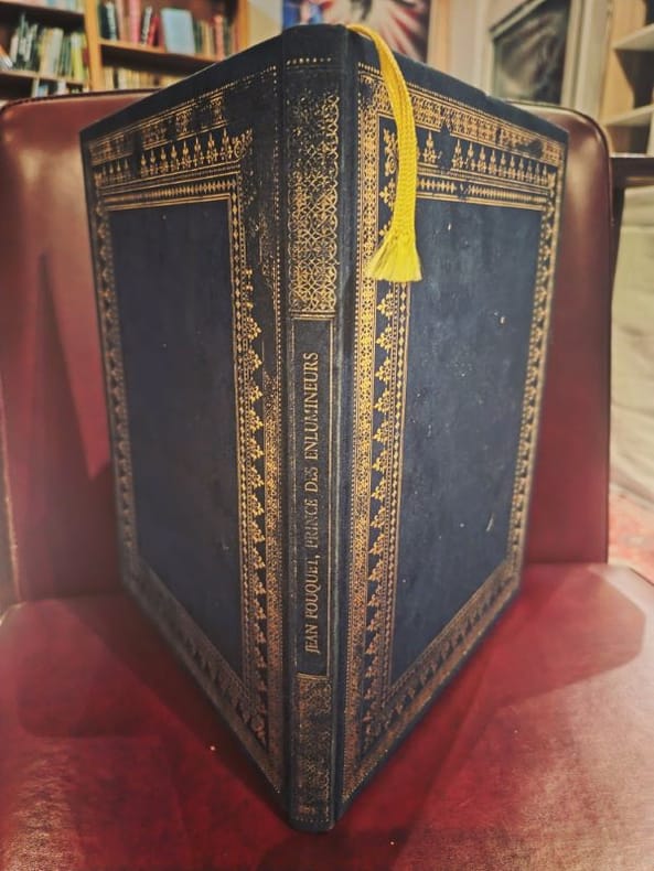 Genève, éditions de la Crémille, 1989. Un volume de format in 4° de 128 pp.; sur beau papier glacé; reproductions soignées de l'oeuvre de Jean Fouquet dans sa quasi intégralité. Reliure de l'éditeur en plein velours bleu-Roi; riches encadrements de guirlandes dorées, titre doré au dos.