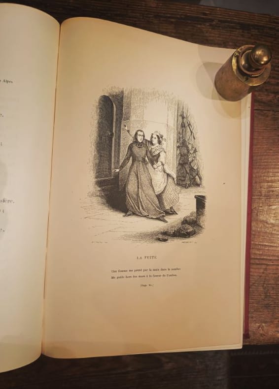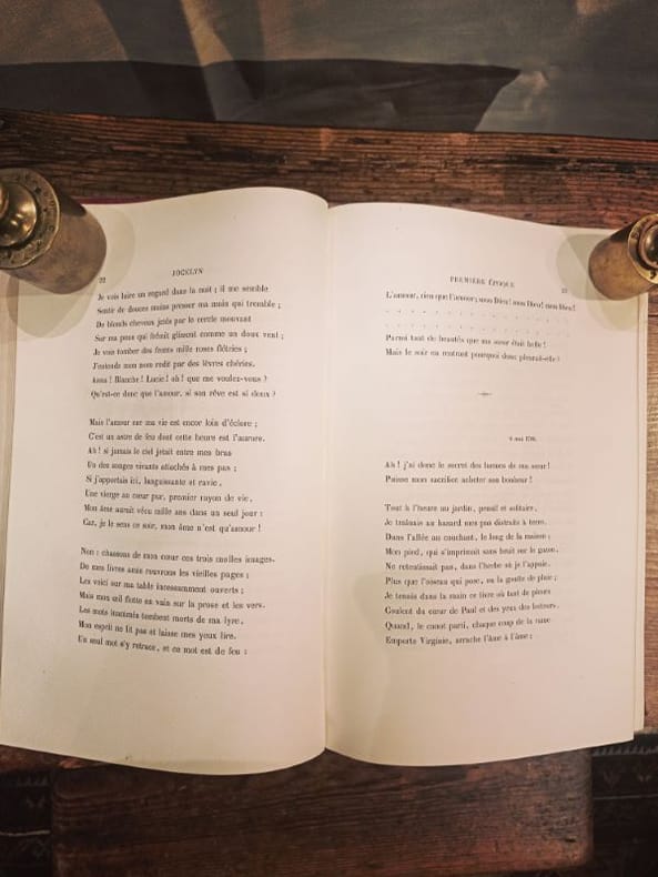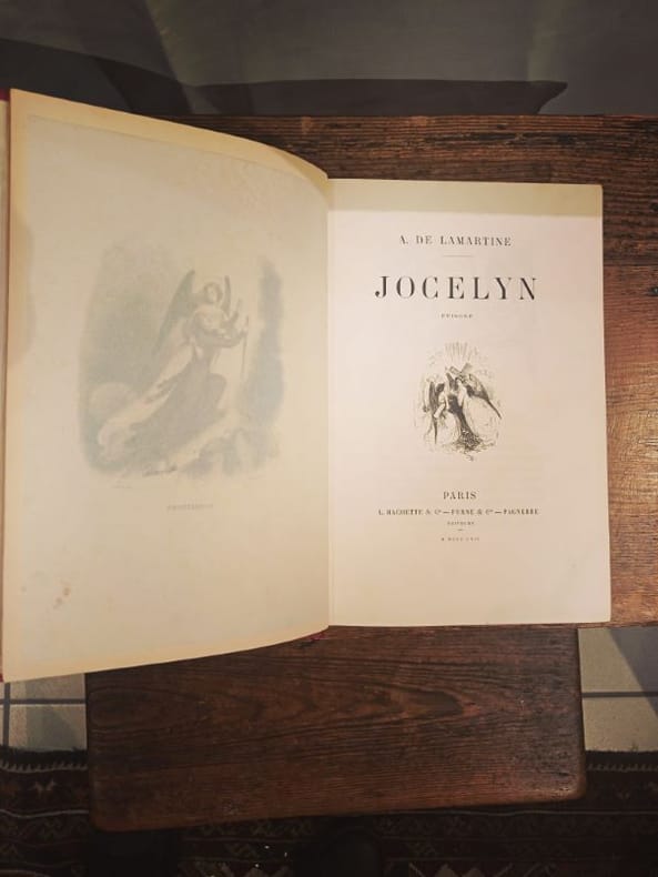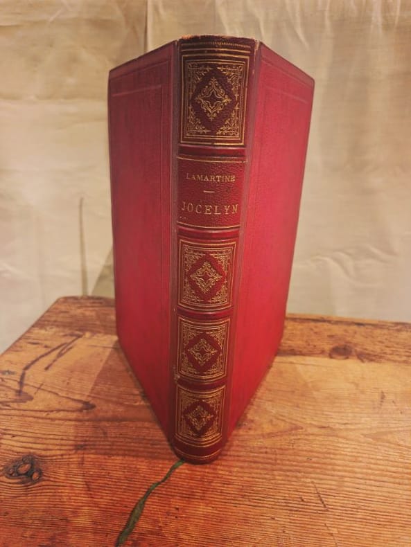 Première édition illustrée et premier tirage, dite édition "Keepsake", en partie originale, comportant 12 planches (frontispice compris) hors texte d'après Marckl, gravées sur bois par Quartley, Dujardin, Herbert, Piaud et Timms, vignettes sur bois dans le texte, et 10 titres-frontispices compris dans la pagination (Carteret III, p. 366 ; Vicaire, IV, 976-77; Talvart XI, 19E) — L'édition originale (non illustrée) date de 1836. – Jocelyn, poème de Lamartine, est le journal et la confession d'un prêtre. Jocelyn est entré au séminaire afin de pouvoir abandonner à sa soeur sa part d'héritage et lui permettre d'épouser l'homme qu'elle aime. Les événements de 1793 l'obligent à se réfugier dans une grotte solitaire des Alpes. Un émigré, poursuivi par les soldats, meurt dans la montagne en confiant à Jocelyn son fils Laurence. Les deux jeunes gens vivent dans les bois, pleins de santé et de bonheur, attirés l'un vers l'autre par de vagues désirs. Enfin, Jocelyn découvre que Laurence est une femme, et une femme qui l'aime tendrement. Un jour, Jocelyn est appelé auprès de son évêque, prisonnier et mourant. Le vieillard lui confère les ordres, afin de pouvoir se confesser à lui. Une soeur de charité va annoncer à Laurence le sacrifice de Jocelyn. Deux années se passent. Jocelyn est devenu curé de Valneige. Après avoir longtemps souffert, il a conquis la paix du coeur. Laurence, pour s'étourdir, s'est jetée dans les plaisirs du monde. Quelques années après, elle vient mourir dans la montagne où elle a vécu heureuse, et c'est Jocelyn qui reçoit sa confession. L'amour, à la fois ardent et chaste, des deux jeunes gens, la grandeur du sacrifice chez Jocelyn, la sérénité où son âme arrive à la fin, les descriptions de la nature amples et abondantes, une pensée philosophique élevée côtoyant parfois une poésie intime et familière, des épisodes de toute beauté comme ceux des Laboureurs, de I'ordination de Jocelyn, des funérailles de Laurence, tels sont les principaux mérites de cette oeuvre. (Imago Mundi)