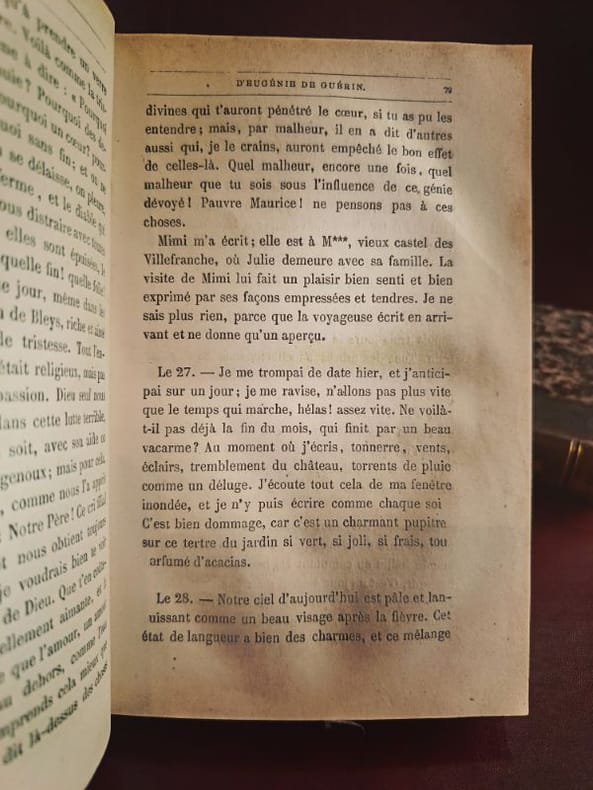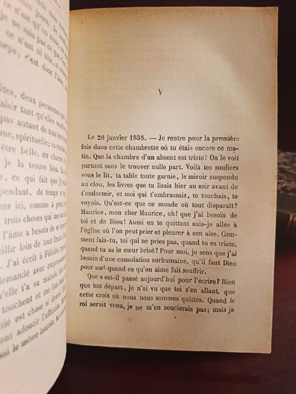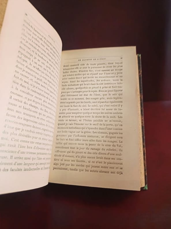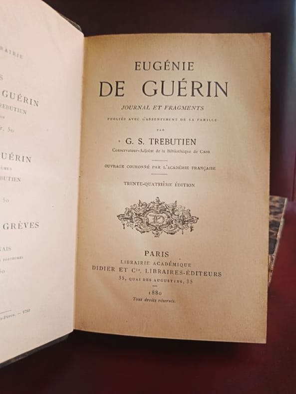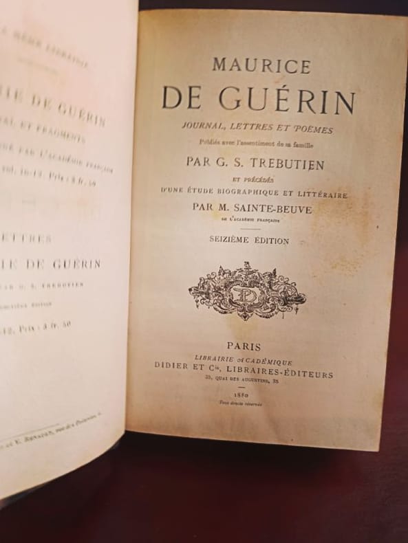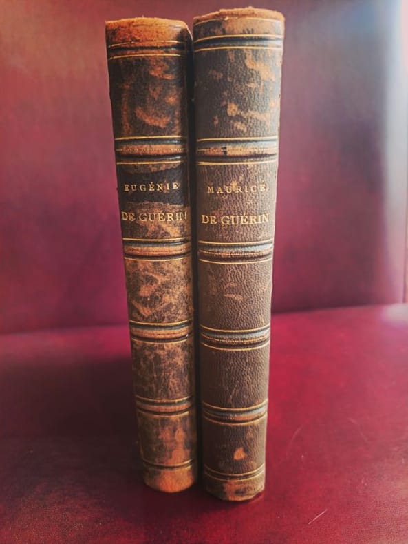 Paris, Didier et Cie 1880 2 in -8 demi chagrin 535 [p.p] Découvrez une correspondance fraternelle légendaire, réunie dans un lot d'exception.Pourquoi choisir entre le frère et la sœur quand leurs âmes ne formaient qu'un seul récit ? Nous avons choisi de vous présenter ces deux ouvrages ensemble, car l'un ne peut se lire sans l'autre. C'est une invitation à entrer dans l'intimité d'une des fratries les plus touchantes de la littérature française.Pourquoi ce lot est indispensable à votre bibliothèque :L'Éclat de Maurice de Guérin : Plongez dans ses Journaux, Lettres et Poèmes. Ce génie foudroyé, mort à 28 ans, est ici sublimé par l'étude biographique de Sainte-Beuve, le plus grand critique de son temps. Vous y découvrirez "Le Centaure" et "La Bacchante", chefs-d'œuvre de la poésie en prose.La Dévotion d'Eugénie de Guérin : Son Journal et Fragments, édité par Trébutien, est le miroir de l'âme de Maurice. Ce texte, d'une pureté et d'une ferveur rares, témoigne du lien indéfectible qui l'unissait à son frère. C'est un document humain d'une puissance émotionnelle absolue.Une cohérence intellectuelle : Posséder ce lot, c'est reconstituer le dialogue interrompu par la mort. C'est offrir à votre collection la vision complète d'un romantisme intérieur, à la fois mystique et mélancolique.Saisissez l'opportunité d'acquérir ce duo littéraire inséparable. Une pièce maîtresse pour tout bibliophile en quête de sens et de beauté.