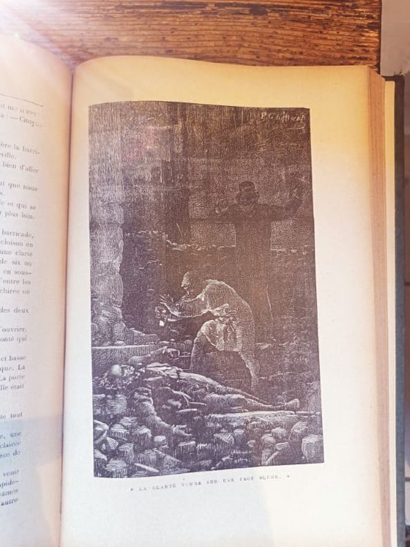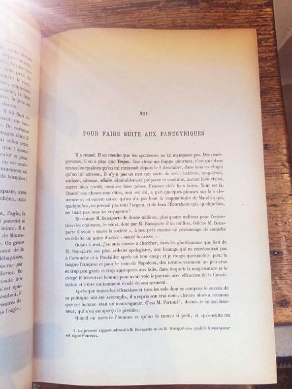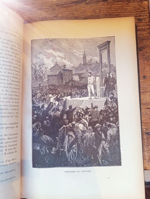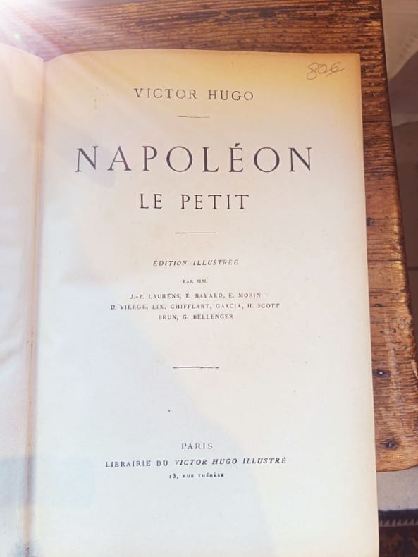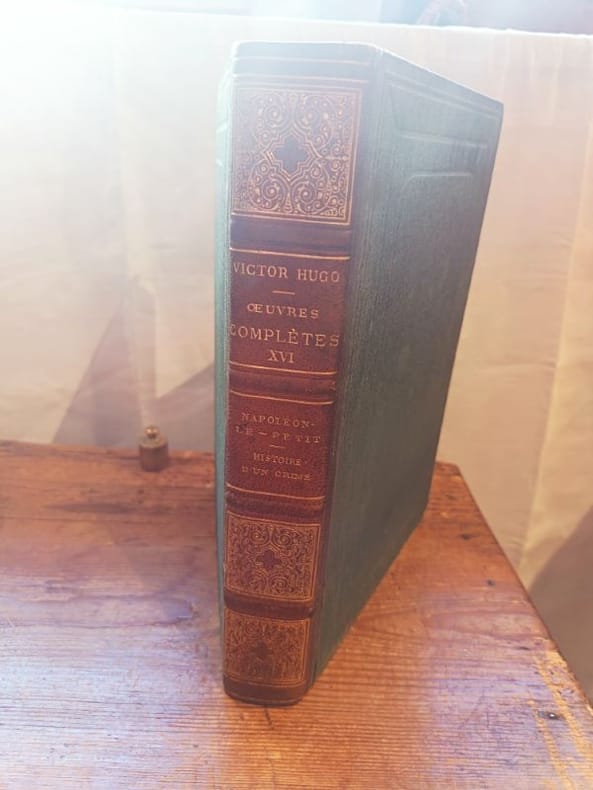 Paris, Eugène Hugues 1851 in-8 demi chagrin et toile LE RÉCIT DU COUP D’ÉTAT PAR L’HOMME QUI L’A DÉFIÉDétenez le témoignage le plus brûlant de l'histoire politique française du XIXe siècle. Dans ce volume XVI des Œuvres Complètes, Victor Hugo endosse le costume de l'historien et du procureur. De la satire cinglante de Napoléon le Petit au récit haletant, heure par heure, du coup d'État dans Histoire d'un Crime, c'est toute l'indignation d'un génie qui s'exprime ici.Les points forts de ce volume :La grandeur de l'Édition Hugues : Ce format de prestige permet une immersion totale dans le texte, soutenu par une mise en page aérée et une typographie noble.L'iconographie documentaire : Les illustrations de ce tome ne sont pas seulement décoratives ; elles restituent l'atmosphère des barricades de 1851 et les visages des acteurs de ce drame historique avec une précision saisissante.Un document de combat : Ce livre n'est pas qu'une œuvre littéraire, c'est une pièce à conviction. Posséder ce tome, c'est posséder l'archive de la résistance républicaine contre l'Empire.Un atout de bibliothèque : Dans sa reliure d'époque, ce tome XVI complète parfaitement votre série "Hugues", affirmant le caractère prestigieux et intellectuel de votre collection.
