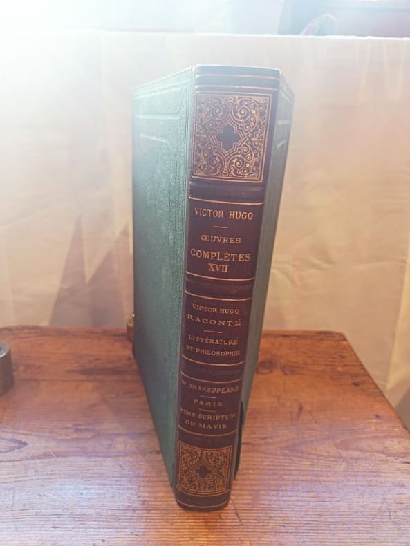 Paris, Eugène Hugues 1851 in-8 demi chagrin et toile AU CŒUR DE LA PENSÉE HUGOLIENNE : LE TESTAMENT INTELLECTUELCe volume XVII est sans doute le plus fascinant pour qui veut comprendre l'homme derrière l'œuvre. Il réunit des textes rares et fondamentaux, allant de la biographie intime (Victor Hugo raconté par un témoin de sa vie) aux sommets de la critique littéraire avec son vibrant hommage à William Shakespeare.Pourquoi ce volume est la clé de votre collection :L’Intimité Dévoilée : Avec Victor Hugo raconté..., vous accédez aux souvenirs les plus personnels de l'auteur, une source inépuisable pour comprendre la genèse de ses chefs-d'œuvre.Le manifeste du Génie : Dans William Shakespeare, Hugo ne parle pas seulement du dramaturge anglais ; il livre sa propre vision de l'art, du beau et de la mission du poète. C'est l'un des textes théoriques les plus puissants du XIXe siècle.Profondeur philosophique : Le recueil Post-scriptum de ma vie, publié après sa mort, offre des méditations poignantes sur l'âme, Dieu et l'éternité. C'est le Hugo philosophe dans toute sa maturité.L’hommage à Paris : Ce tome contient également ses écrits sur la capitale, le cœur battant de son œuvre, illustré avec la majesté propre à l'édition Hugues.