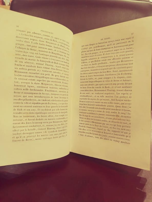 Les planches gravées sur acier de J. Outhwaite (né à Londres, exposa à Paris de 1836 à 1877 Bénézit VIII/64), représentent des vues de Fribourg (la cathédrale et une partie de la ville vues de la région de la Motta), de la cathédrale de Berne et d'Einsiedeln. Le titre gravé porte une vignette représentant la prière au chalet.