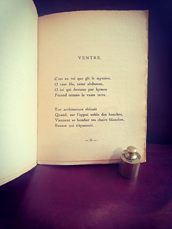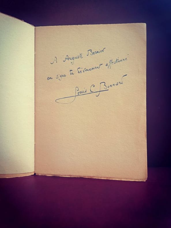 Paris, Librairie de France 1931 1 in -8 Broché 71 [p.p] Imaginez un instant le Paris de 1931. Dans le calme feutré d'un cabinet de travail, l'auteur L.C. Bonnard trace d'une main assurée une dédicace à l'attention d'Auguste Bernier, poète et esthète reconnu. Cet exemplaire n'est pas une simple unité issue d'un tirage ; c'est un témoignage vivant, un lien tangible qui unit deux hommes de lettres autour d'une fascination commune pour la beauté. Posséder cet ouvrage, c'est intégrer ce cercle intime et devenir le nouveau gardien d'une conversation interrompue il y a près d'un siècle.Dans cette édition de la Librairie de France, le choix a été fait de l'épure absolue. Ici, aucune illustration ne vient imposer une vision : c'est le texte, et lui seul, qui sculpte la grâce. L'auteur livre une ode vibrante et d'un respect sacré à la morphologie féminine. Sa plume, d'une sensualité délicate et d'une sincérité désarmante, parvient à faire naître des images bien plus puissantes que n'importe quelle gravure. C'est une œuvre qui se lit avec l'esprit et se ressent avec le cœur, une célébration de la ligne et du mouvement par la seule magie du verbe.Le papier, caractéristique des belles éditions de l'entre-deux-guerres, possède cette matité et ce grain particulier qui appellent le toucher. L'encre de la dédicace, encore vibrante sur la page de garde, ajoute une dimension humaine et unique à l'objet.Pourquoi cet exemplaire est indispensable à votre bibliothèque :Provenance prestigieuse : Un envoi autographe à Auguste Bernier, pièce de choix pour tout collectionneur de provenance (« Association »).Rareté thématique : Une approche littéraire et respectueuse de la sensualité, rare dans les éditions de cette période souvent plus graphiques.Condition : Un exemplaire qui a traversé le temps, conservant tout le charme et l'odeur rassurante des bibliothèques d'autrefois.Une opportunité rare d'acquérir non seulement un livre, mais une part de l'intimité littéraire du XXe siècle.