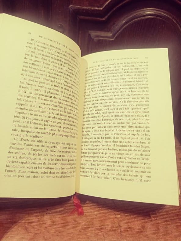 estienne michallet 1699 in-12 A Paris, Chez Estienne Michallet, 1699, 1 volume in-12 de 95 x 255 mm environ, (16) ff. (Page de titre, Discours sur Theophraste), 52 pages (Caractères de Théophraste), 662 pages ( Les Caractères ou les moeurs de ce siècle), xliv pages (Discours), (3) ff. Reliure plein parchemin portant titres dorés sur pièce de cuir bordeaux, tranches mouchetées, gardes marbrées au motif feuille de chêne. Trou de 3 mm environ de diamètre sur la partie inférieure du dos, ainsi qu'un discret trou de ver au niveau de la pièce de titre, ex libris ôté ayant arraché des parties de la garde du contreplat supérieur, rares rousseurs, bel état malgré les défauts signalés.