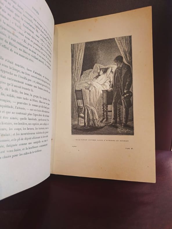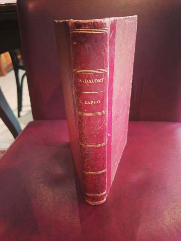 Paris, G.Charpentier SD 1 in -8 demi chagrin rouge, dos à nerfs ornés 233 [p.p] L'un des chefs-d'œuvre de Daudet, explorant les méandres d'une passion obsessionnelle dans le milieu artistique et mondain parisien. Cet exemplaire est revêtu d'une reliure d'époque élégante qui souligne le caractère prestigieux de l'édition Charpentier.Reliure : Belle reliure en demi-chagrin rouge. Le grain du cuir est bien conservé.Dos : Dos à nerfs soulignés de filets dorés, caissons ornés de motifs floraux ou géométriques. Dos non fendu.État : Bel aspect général, coiffes et coins bien préservés.