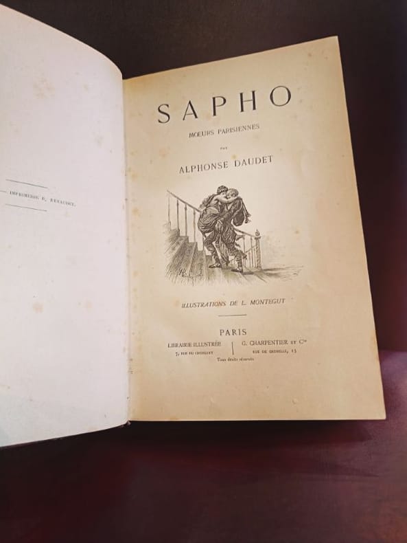 Paris C. Marpon & E. Flammarion 1887 in 12 (18,5x12) 1 volume reliure demi maroquin rouge de l'époque, couverture illustrée conservée, 376 pages, illustré de nombreuses gravures en noir et blanc dans le texte. Illustrations de Rossi, Myrbach, etc. Gravures de Guillaume frères et Cie. Collection artistique E. Guillaume & Cie. Alphonse Daudert, Sapho. moeurs parisiennes. Bel exemplaire ( Photographies sur demande / We can send pictures of this book on simple request )