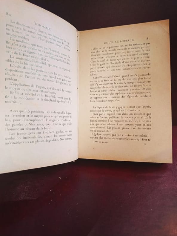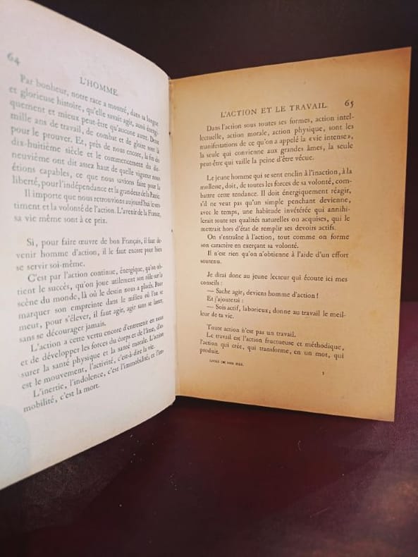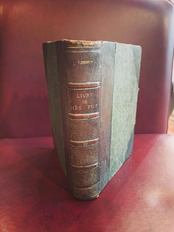 Paris, Vuibert et Nony 1906 1 in -8 Demi chagrin, dos à caissons, coins en cuir 341 [p.p] L'ouvrage de référence de Paul Doumer sur l'éducation et le devoir. Écrit avec la rigueur et la clarté qui caractérisaient l'homme d'État, ce livre propose une ligne de conduite morale pour les jeunes hommes du début du XXe siècle. Un témoignage historique et sociologique majeur sur les valeurs républicaines de la Belle Époque.Reliure : Belle présence en bibliothèque avec ses coins en cuir et son dos richement orné.État : Mors interne fendu, toutefois la reliure reste parfaitement fonctionnelle et les plats sont bien maintenus.Dos : Dos à nerfs avec caissons décorés, dorures bien visibles.Intérieur : Excellente tenue, toutes les pages sont parfaitement solidaires du corps d'ouvrage.