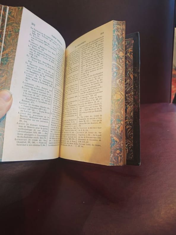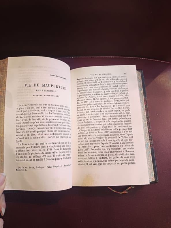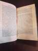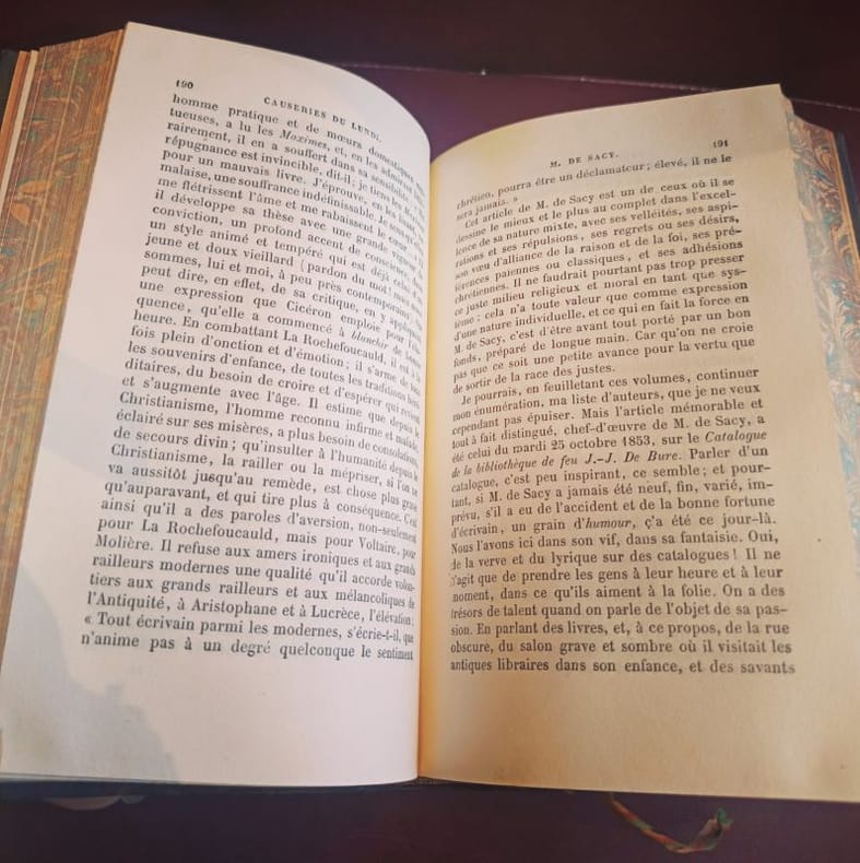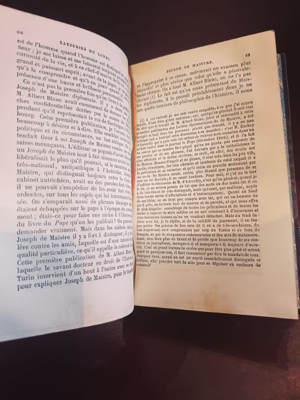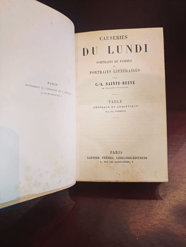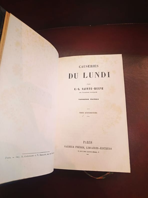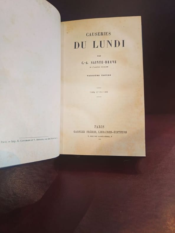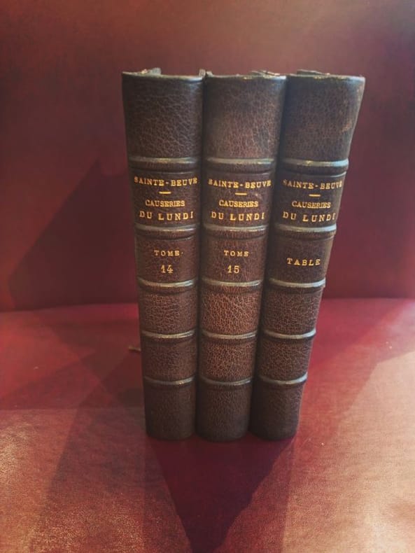 Paris, Garnier Frères 1920ca 3 in 12 demi chagrin , dos à nerfs Rare ensemble cohérent regroupant les derniers volumes de l’œuvre monumentale de Sainte-Beuve. Les Causeries du Lundi représentent le sommet de la critique littéraire du XIXe siècle, où l'auteur révolutionne le genre par sa méthode biographique et psychologique.Ce lot comprend :Tome 14 : Études critiques et littéraires.Tome 15 : Suite et fin des chroniques hebdomadaires.Volume de Table et Portraits : Contient la Table générale alphabétique et analytique, outil de travail indispensable pour naviguer dans l'ensemble de la collection, ainsi que les célèbres Portraits de femmes et Portraits littéraires.État de conservationReliure : Bel ensemble en demi-chagrin d'époque. Les trois volumes présentent une parfaite unité de décor. Le cuir est sain et robuste.Dos : Dos à nerfs ornés de caissons aux fers dorés. Dos non fendus, assurant une excellente tenue en bibliothèque.Intérieur : Intérieurs très frais, papier de qualité bien conservé.