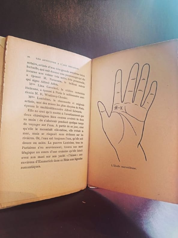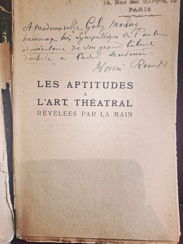 Paris, Albin Michel 1 in -8 Broché couverture Illustrée 190 [p.p] Ouvrage insolite et rare étudiant les liens entre chirologie et talent scénique. Cet exemplaire est d'autant plus précieux qu'il fut offert par l'auteur à Gaby Morlay, star incontestée du théâtre et du cinéma français. Une rencontre fascinante entre la théorie de la main et l'une des plus grandes interprètes du XXe siècle.