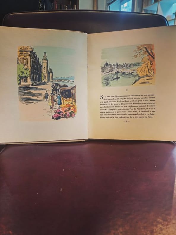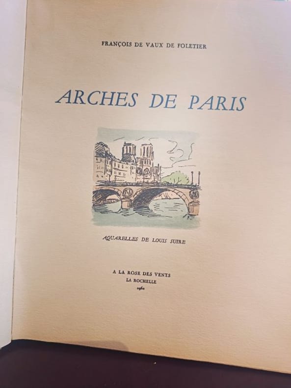 La Rochelle, A la rose des vents 1960 1 in -4 broché sous couverture illustrée rempliée 103 [p.p] Une œuvre d'art totale où l'érudition de François de Vaux de Foletier s'unit au pinceau lumineux de Louis Suire. L'artiste rochelais délaisse ses côtes atlantiques pour saisir avec une délicatesse infinie les courbes et les reflets des arches de la capitale. Chaque aquarelle est une ode à la lumière de Paris.
