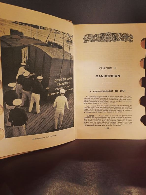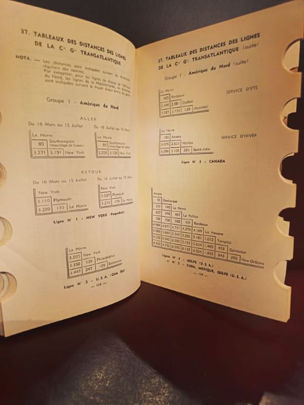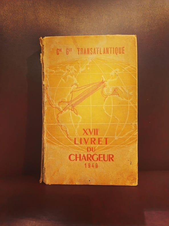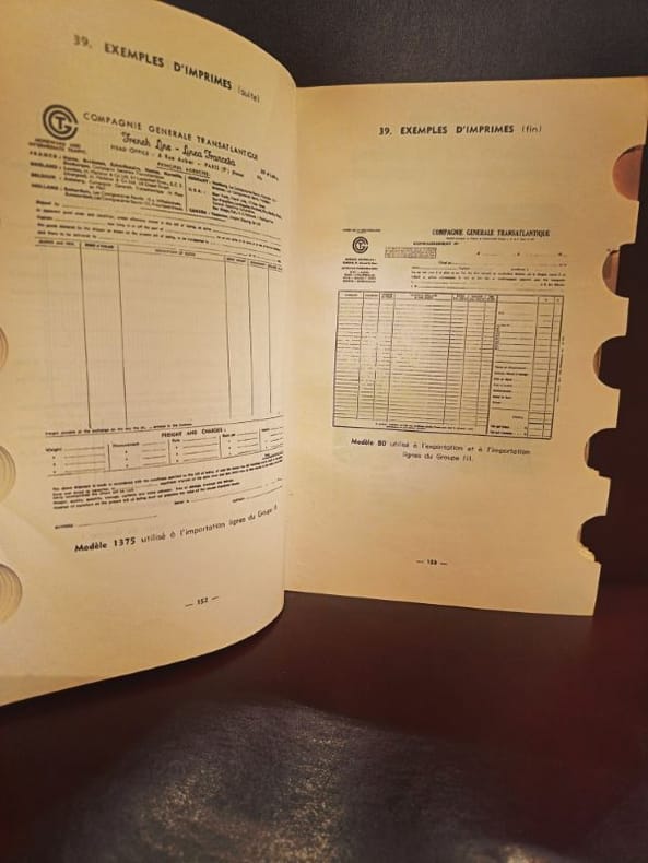 Paris, Compagnie générale transatlantique 1949 1 in -8 Broché couverture Illustrée 693 [p.p] Un document technique indispensable pour comprendre l'organisation du fret maritime français à la fin des années 40. Ce livret répertorie l'ensemble des lignes de la Compagnie (Atlantique Nord, Pacifique, Afrique du Nord, Antilles), les caractéristiques de la flotte de cargos et de paquebots-mixtes, ainsi que les réglementations portuaires de l'époque.