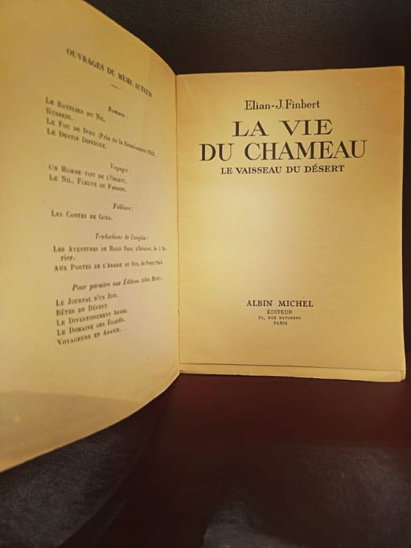Paris, Albin Michel 1938 1 in -8 Broché couverture Illustrée 246 [p.p] Une étude fascinante et poétique sur le "vaisseau du désert". Élian J. Finbert, grand connaisseur de l'Orient, livre ici une observation quasi intime de la vie des camélidés. Il explore leurs mœurs, leur endurance et leur relation millénaire avec les nomades. Un texte qui mêle science, aventure et philosophie du voyage.
