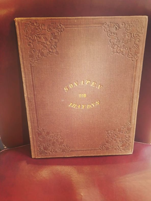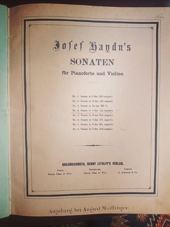 Braunschweig, Henry litolff SD 1 in -4 toile avec couverture illustrée et engravée dorée 32 [.p] RARE PARTITION D’ÉPOQUE — HAYDN, SONATE EN FA MAJEUR POUR PIANO ET VIOLONÉdition Henry Litolff, Braunschweig — couverture illustrée et gravée dorée, un vrai bijou de bibliophilie musicale.Bon état : pages propres, reliure solide, couverture intacte — idéal pour musiciens, collectionneurs, ou amateurs d’art musical du XIXe siècle.Pour ceux qui veulent jouer Haydn comme en 1880 — ou simplement admirer une partition qui respire l’élégance d’un autre temps. “Une sonate, une couverture dorée, une histoire — ce n’est pas qu’une partition, c’est un moment suspendu.”